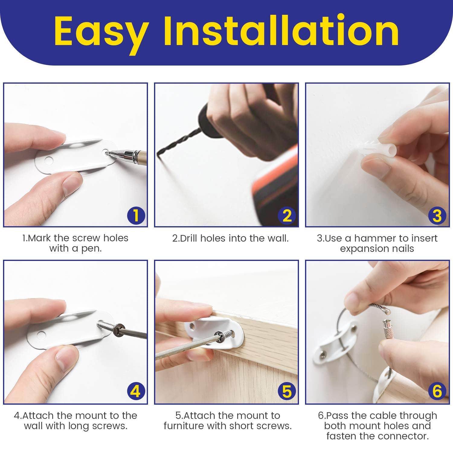 - EASY TO INSTALL: Using a screwdriver and drill driver can quickly install the anti-tip furniture anchors in minutes. The heavy duty baby proofing kit includes all necessary hardware and supports vertical or horizontal mounting for different furniture;