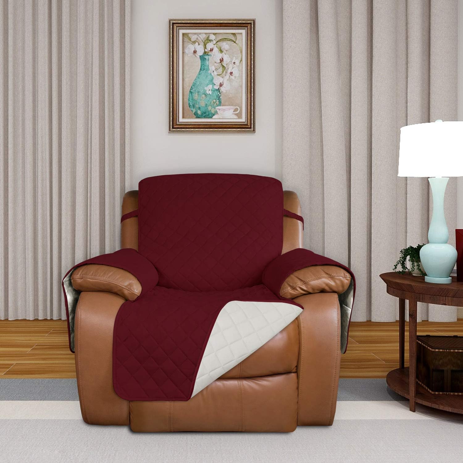 PureFit Reversible Quilted Sofa Cover, Water Resistant Slipcover Furniture Protector, Washable Couch Cover with Non Slip and Elastic Straps for Kids, Dogs, Pets (Oversized Recliner, Red/Ivory)