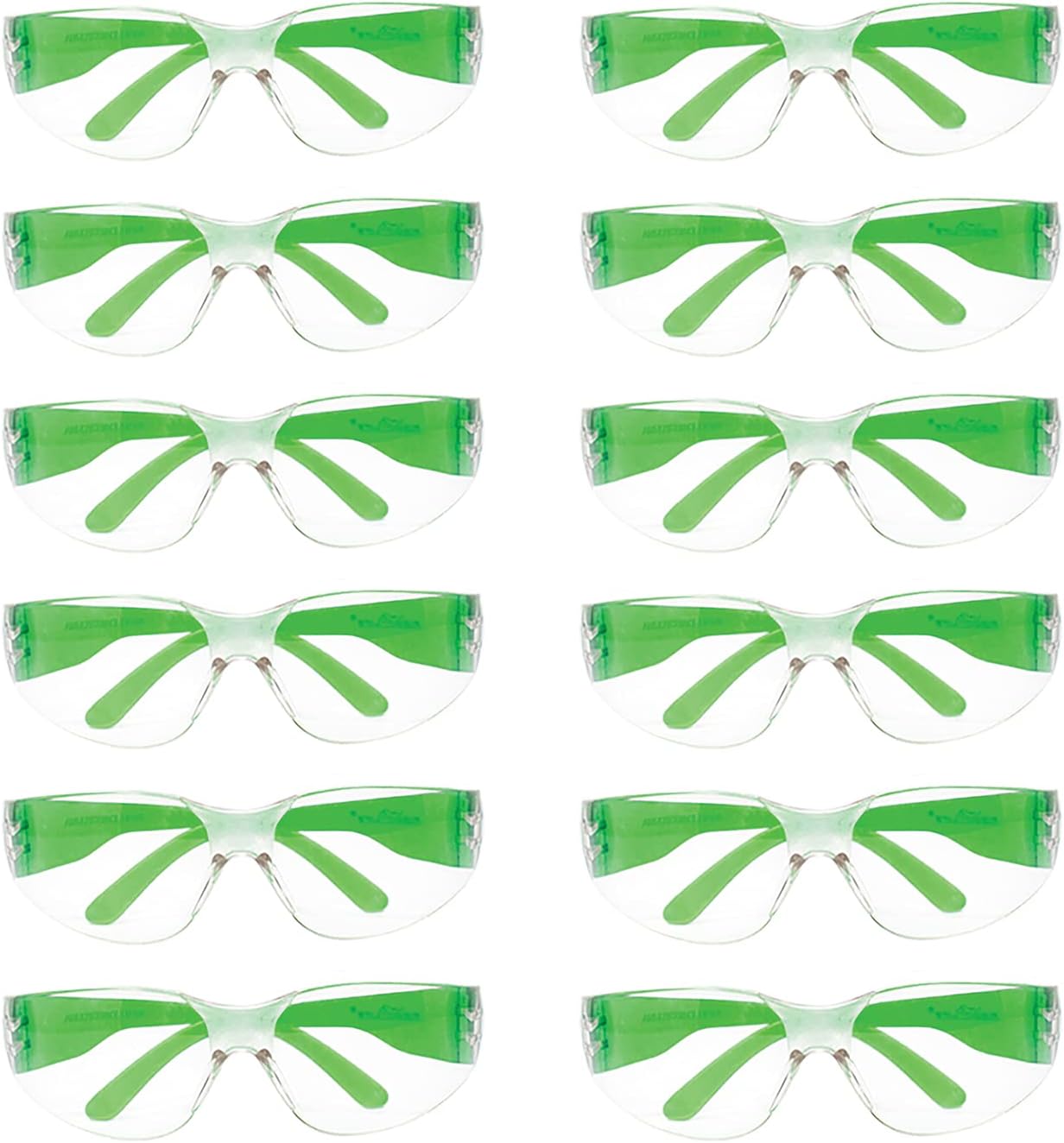 - Color & One Size Fits Most – Fits adults, teens, and older children. 12 piece pack of Green safety glasses. Usage can include, but is not limited to: Medical, Industrial, Dental, Construction, Janitorial, School, Daycare, College, etc.