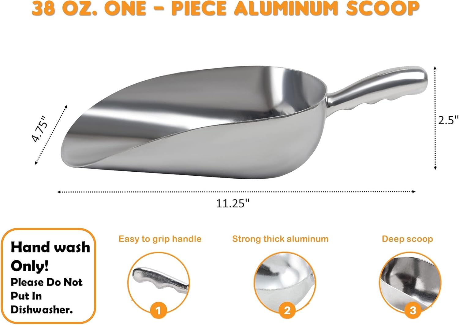 - SMOOTH SURFACES FOR EASY CLEANING - the scoop is made of durable food-grade aluminum hand wash only please do not put in dishwasher!