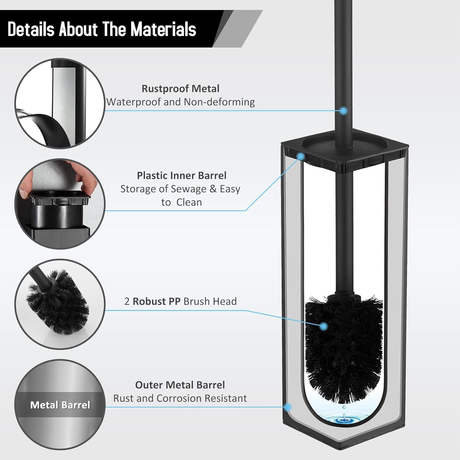 - Premium material:Toilet brush and holder made of heavy duty type stainless steel with matt black looks good sitting next to your toilet bowl; it's a great addition to your bathroom accessories and assures you can find it when you need it.