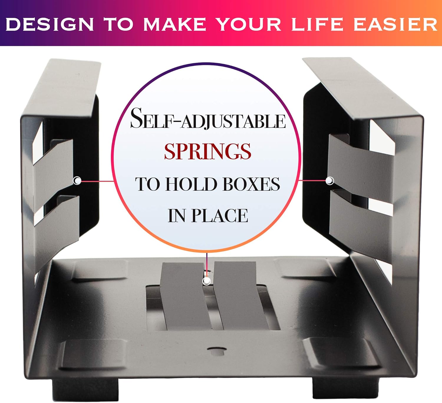 - Self-Adjusting Springs: Our gloves holder features self-adjusting springs that allow it to hold different box sizes for your convenience. A perfect disposable glove holder wall mount solution.
