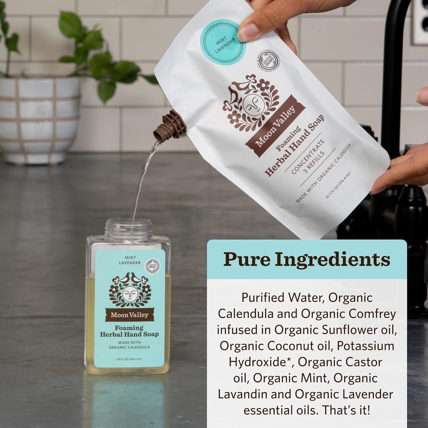 - REFILL PACK: This is a bundle of two 10.7oz Mint Lavender Refill Pouches for Moon Valley foaming hand soap dispensers. Each pouch comes with enough concentrate to refill a standard recyclable dispenser three times. Unlike liquid soap, this concentrate is formulated for foaming dispensers.