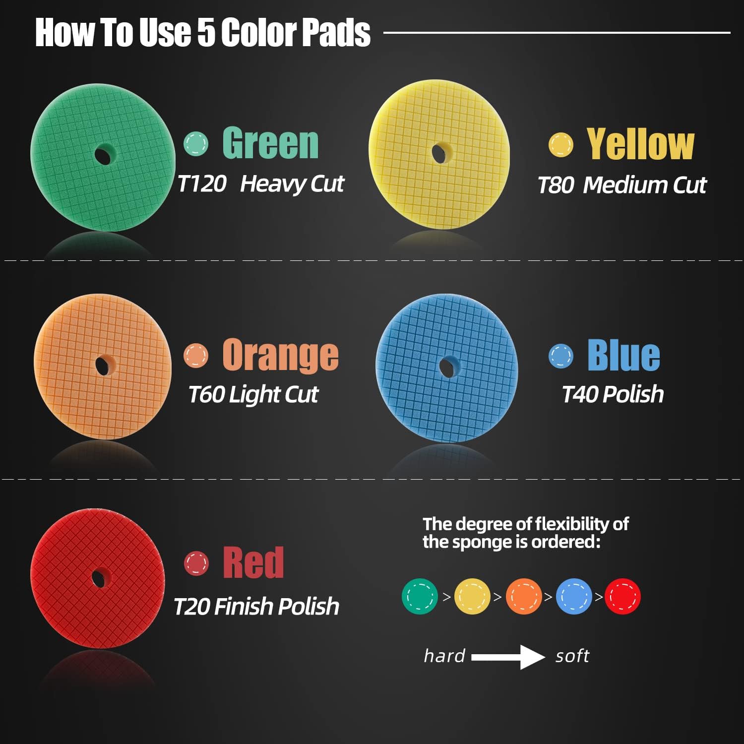 - Compounding & Polishing & Waxing in 1 set◆ Bring your car back to shiny! Great for removing sun abuse, car scratches, headlight wearing and etc. Green and Yellow compounding pad suitable for removing oxidation coating and moderate to light scratches. Orange and Blue polishing pad for removing sun abuse and swirl mask. Red pad for finishing and waxing.