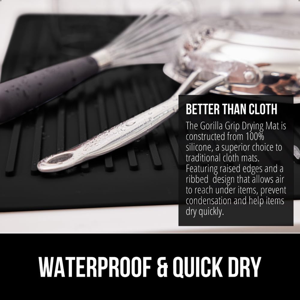 GORILLA GRIP 100% BPA-Free Patented Silicone Dish Drying Mat for Kitchen Counter, Water Catching Ribbed Design, Easy Clean Waterproof Sink Liner, Heat Resistant, Fits Under Rack, 13x11 Inch, Black