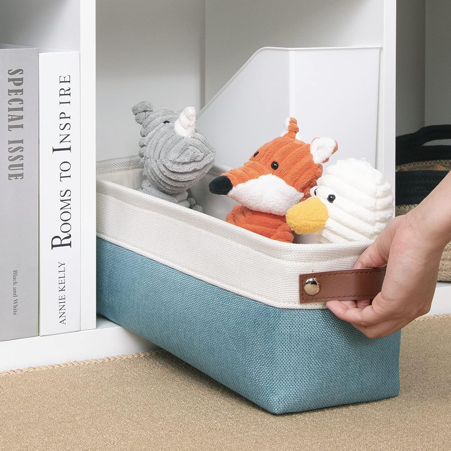 - 【EASY TO CARE】The narrow storage basket is sturdy and has no odor. Built to last these bins are reinforced with an O-ring on the top to give shape and structure so they are not machine washable. Lined with a thin linen fabric, the small storage bins are easy to clean, just wipe with a damp sponge or cloth.