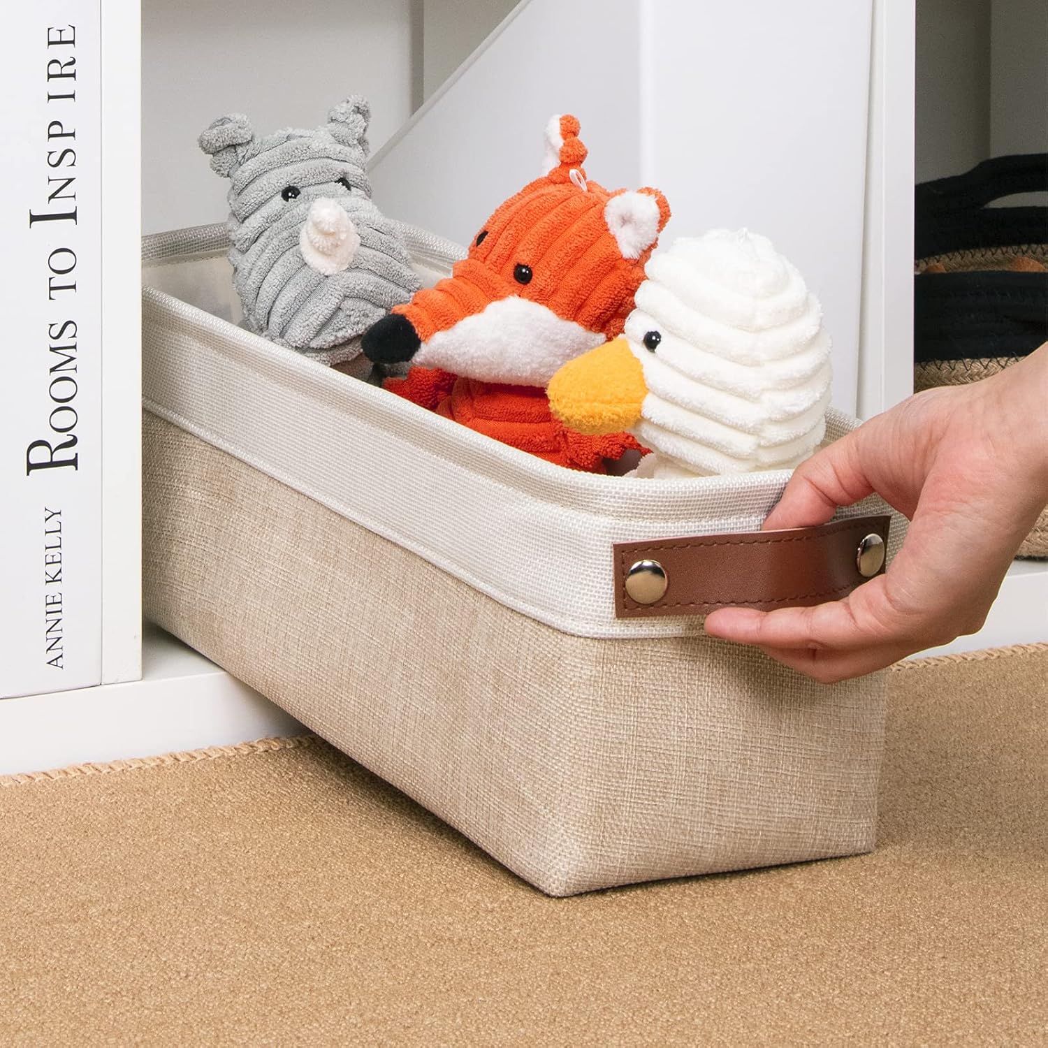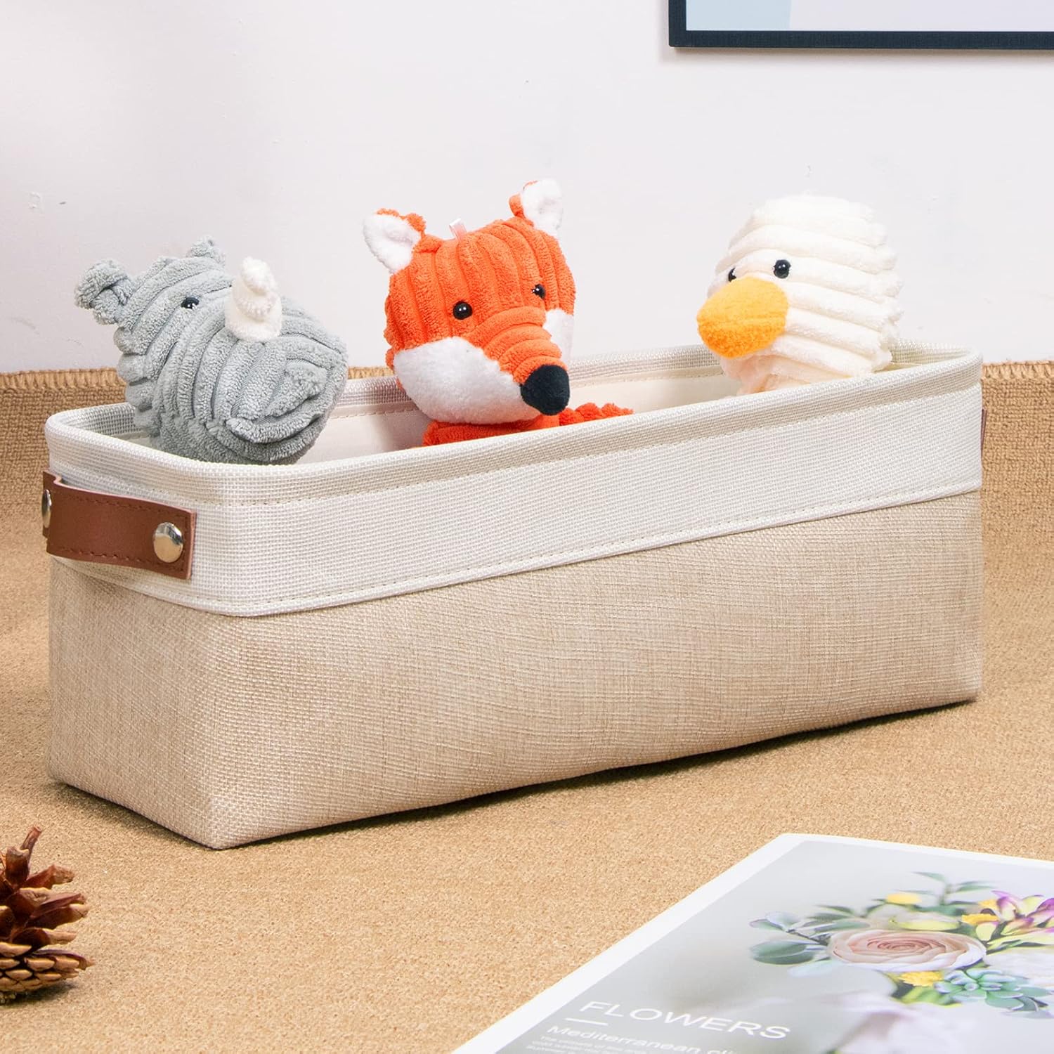 - 【EASY TO CARE】The narrow storage basket is sturdy and has no odor. Built to last these bins are reinforced with an O-ring on the top to give shape and structure so they are not machine washable. Lined with a thin linen fabric, the small storage bins are easy to clean, just wipe with a damp sponge or cloth.