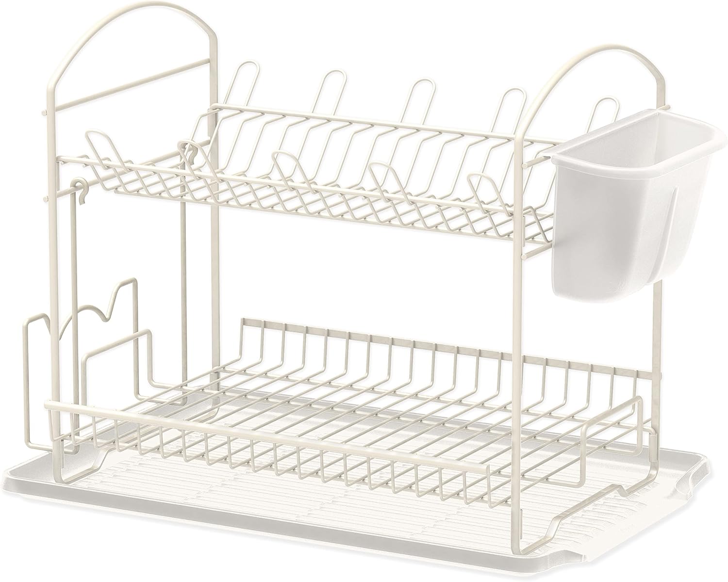 - Classic white coating finish 2 tier dish rack with black drainboard, cutlery bucket and cutting board holder.