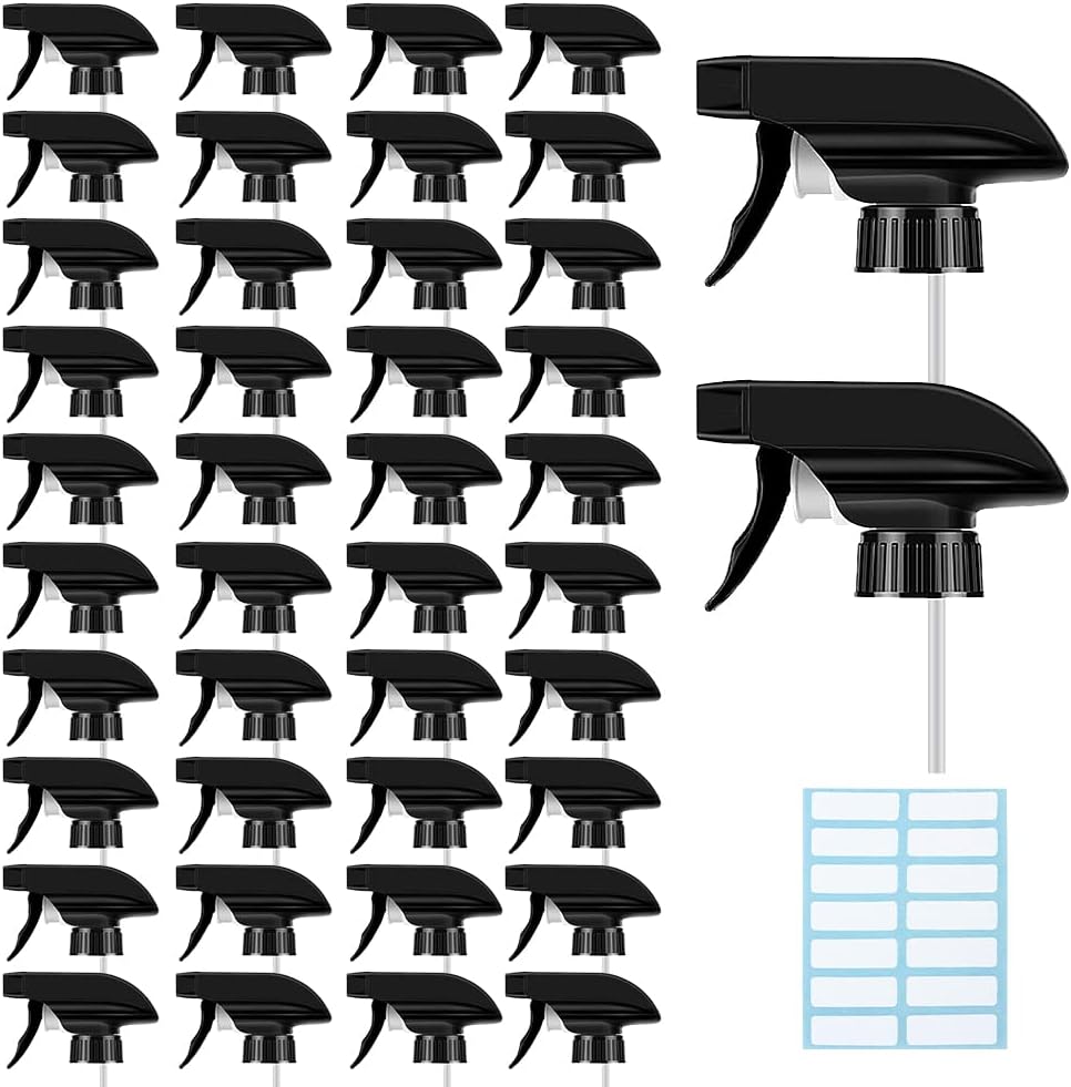 AMORIX 50PCS Spray Bottle Tops Black Trigger Sprayer Heavy Duty Replacement Nozzle with Mist Spray & Stream Sprayer, Fits Standard 28/400 Neck Bottles + Tag Label Stickers