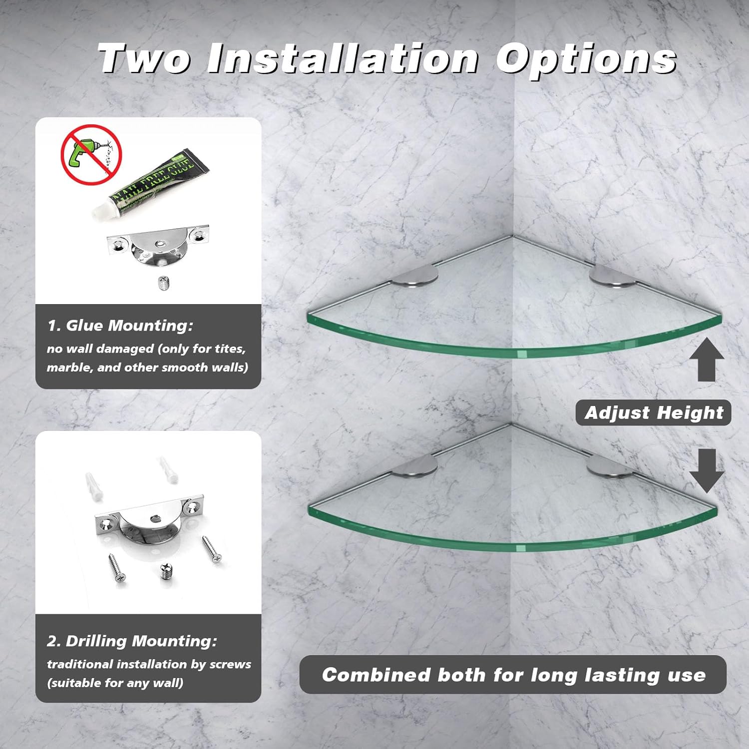 Corner Glass Shower Caddy 2 Pack 8MM-Thick Tempered Glass Shelf No Drilling Wall Mount Corner Mounted Shelves Space Saver Adhesive Bathroom Home Shelf Shampoo Holder Organizer Strong Adhesion