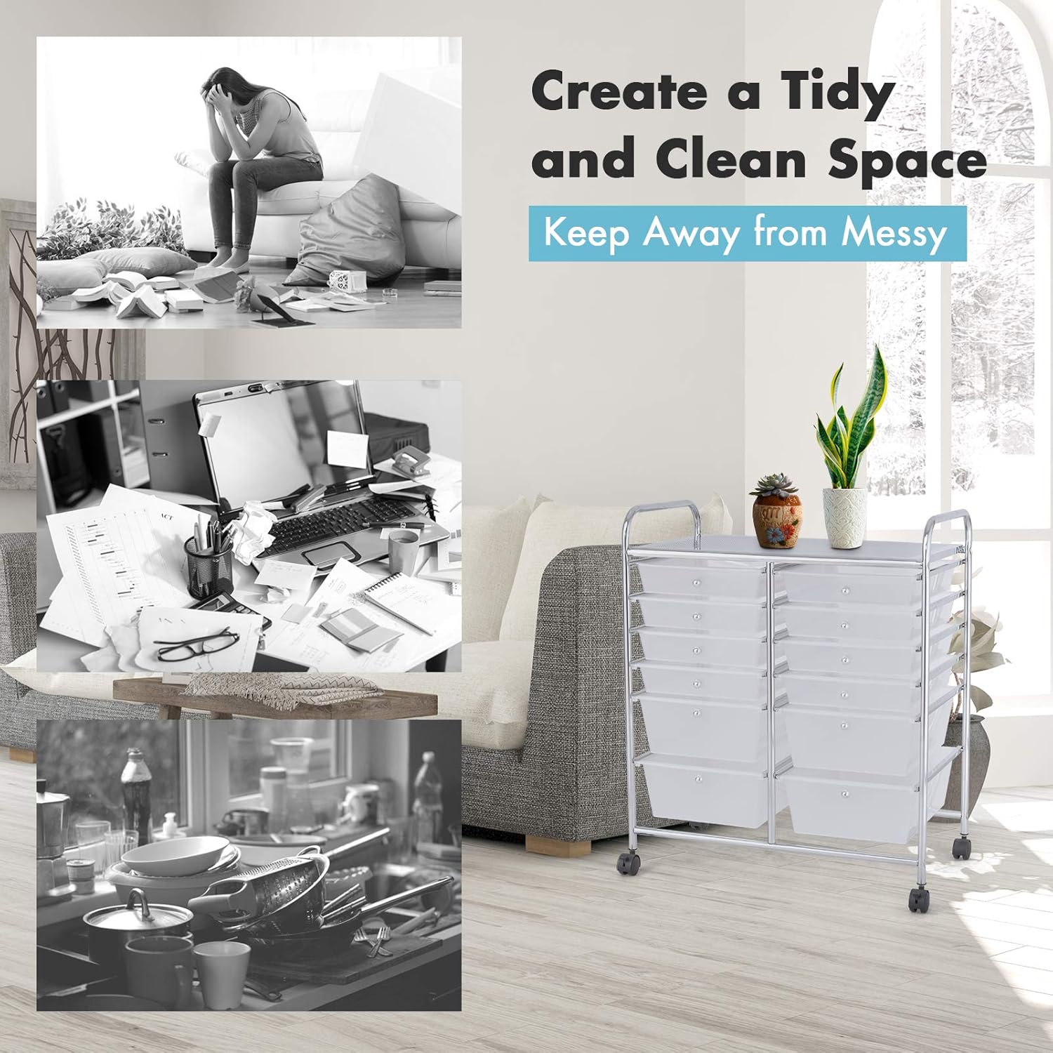 GOFLAME 12-Drawer Rolling Storage Cart, Multipurpose Organizer Cart with 2 Sizes Plastic Drawers, Mobile Utility Cart with Lockable Casters for School, Home Office, Beauty Salon, Clear