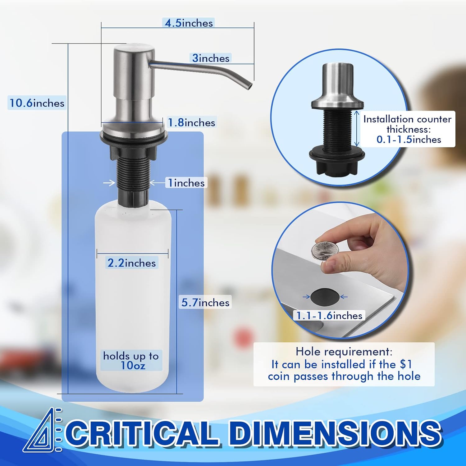 - Optimization Design: First-rate stainless steel kitchen soap dispenser for kitchen sink makes your kitchen simple and fresh, easy to fit most sink. Installing it in any type of kitchen sink or countertop (granite, stainless steel, wood)makes more convenient to use.
