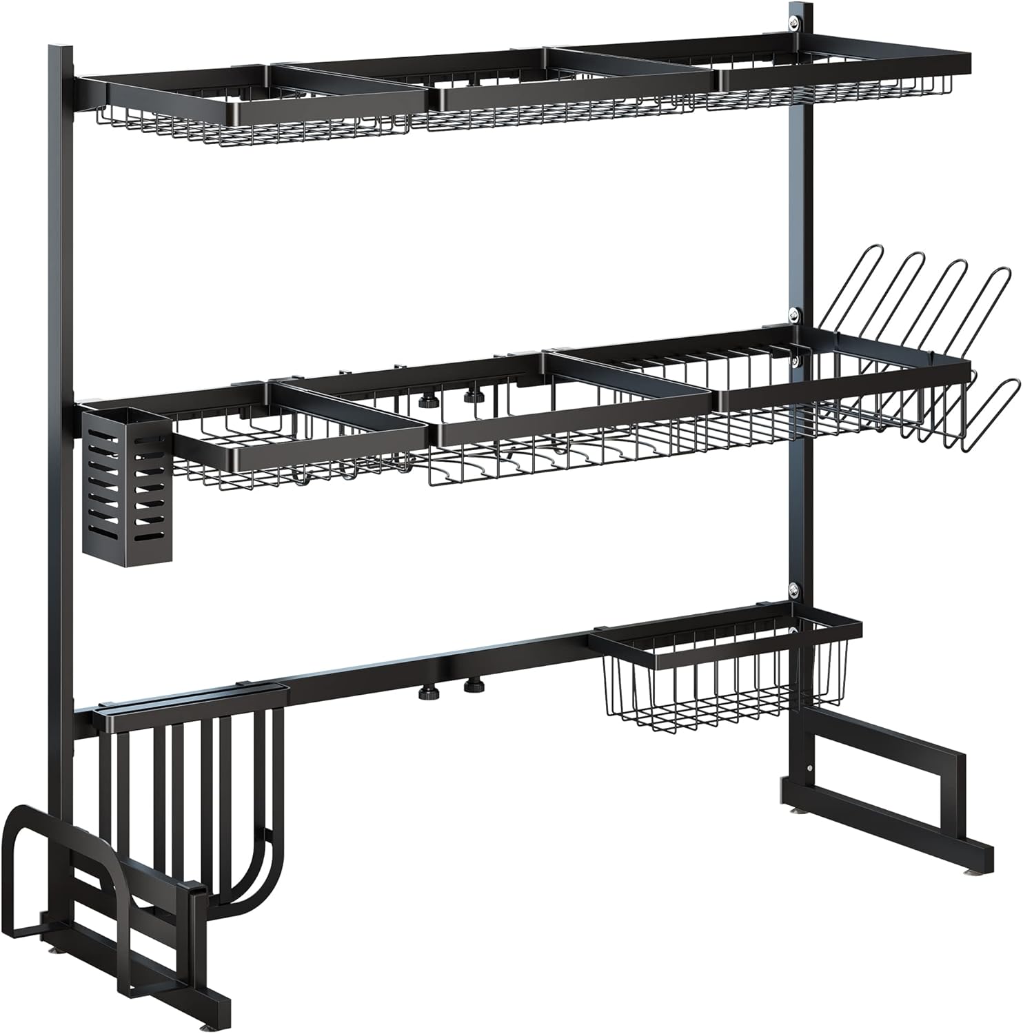 Over The Sink Dish Drying Rack, 3 Tier Adjustable (33.8 to 41.5 inch) Large Capacity Kitchen Counter Dish Drying Rack with Fruit Basket Utensil Holder Sink Caddy Cup Holder, Black