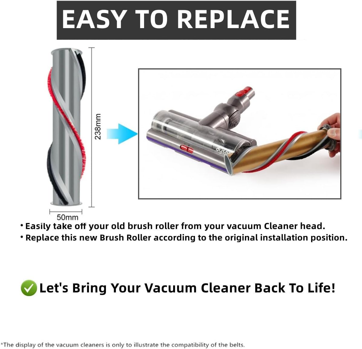 - EASY TO INSTALL & CLEAN - Easily take off your old brush roller from your vacuum head and install this new one, which is reusable and durable; equiped with a cleaning brush for cleaning your roller conveniently, have a long service life.