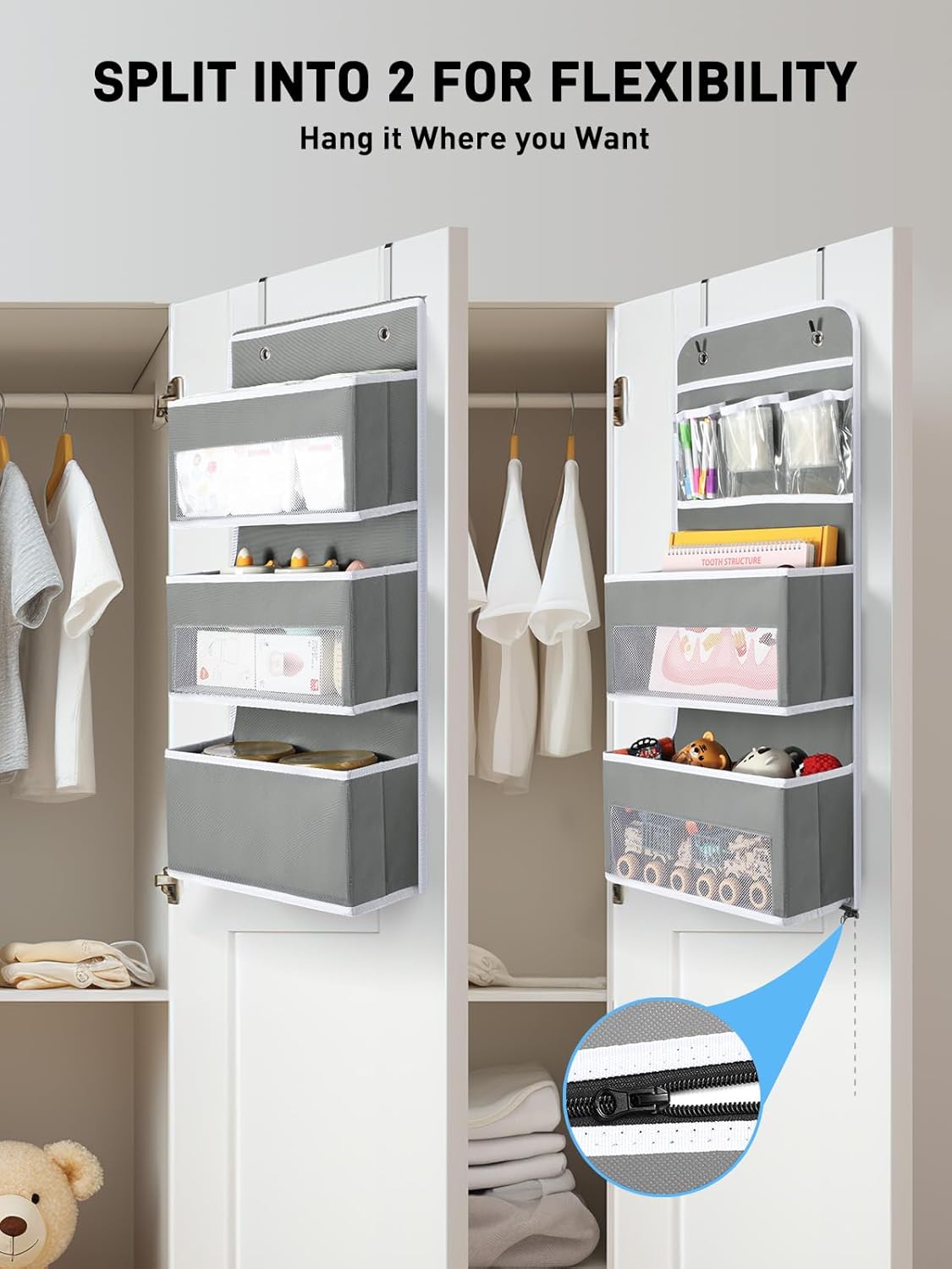 - 1 Long Split into 2 Short: Allows you to use as one 6-shelf diaper baby organizer that runs the full length of your door for dedicated storage in one place, or split it into two 3-shelf ones for flexible uses in a small closet, bathroom, camper, RV, baby room or where space is limited