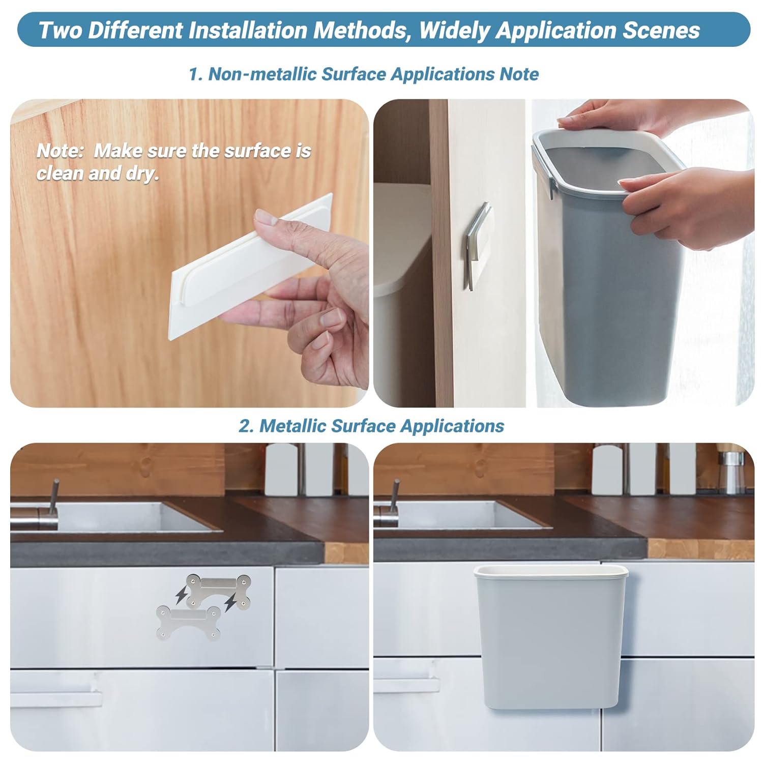 - Two Installation Options - Come with two different installation methods accessories. The first one is a strong magnetic holder, which can easily attach to metal surfaces. The second one is an adhesive patch and hook, you can stick it anywhere you want after rip off the adhesive strip, then easily hang the trash can.