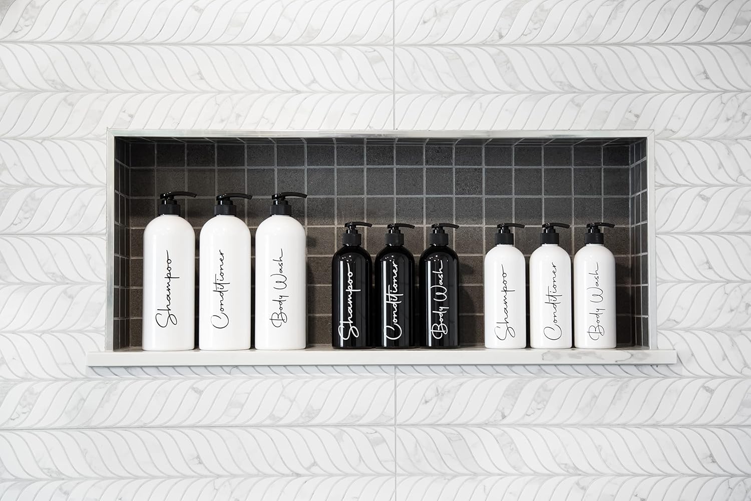- LUXURIOUS HIGH-END STYLE APPEAL - A luxurious high-end look offsets your bathroom beautifully with elegant black script on a clean white background. Gorgeous silkscreened labels are permanent and peel-proof. Go from cramped and cluttered to soothing and spa-like.