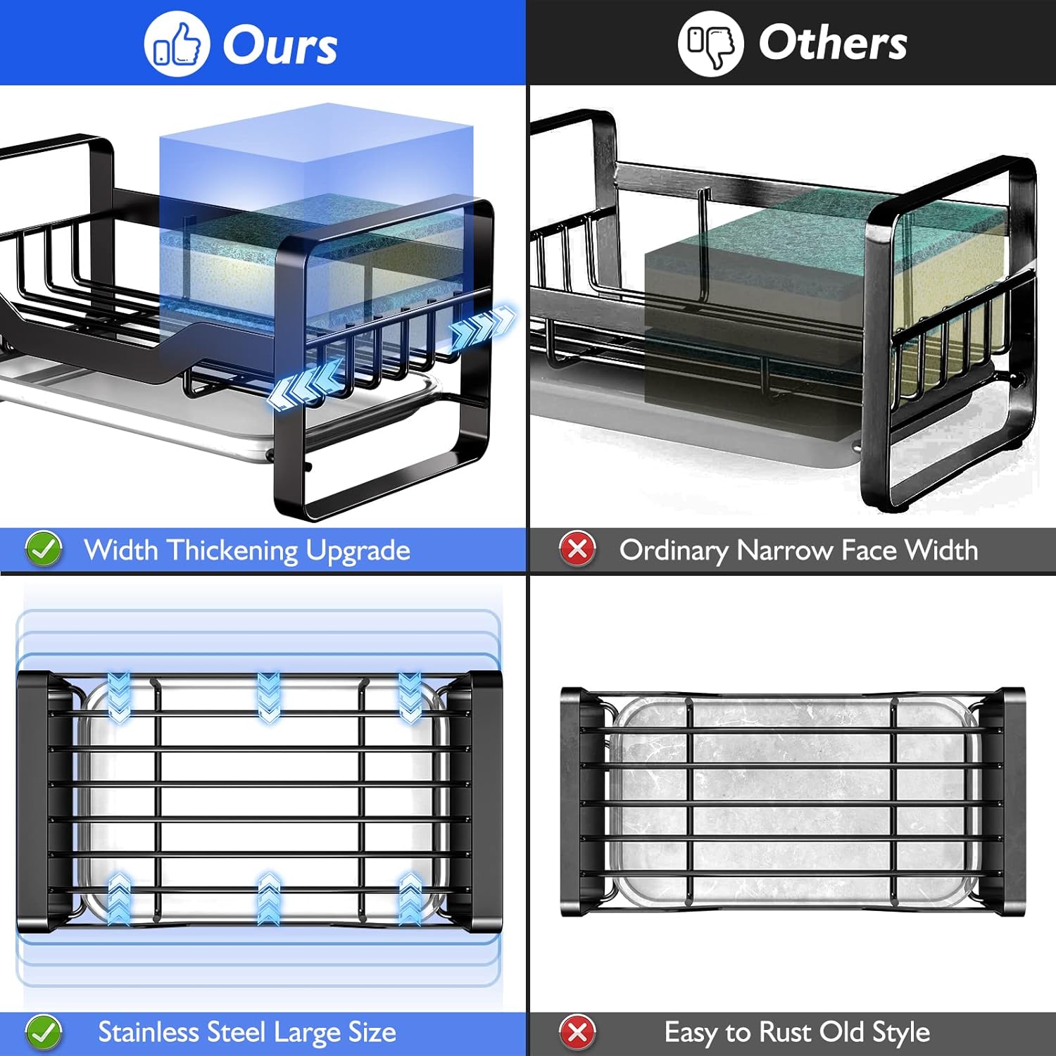 - ăLarger CapacityăExtended to 4 inches in width and 7.15 inches in length. Compared with other kitchen sink sponge holder , the length and width are improved. Therefore, this sponge holder can bring more storage space and improve the storage capacity. The Kontoyo sponge holder is perfect for storing sponges,dish soap,soap dispenser,brushes. Keep your kitchen sink counter clean and tidy