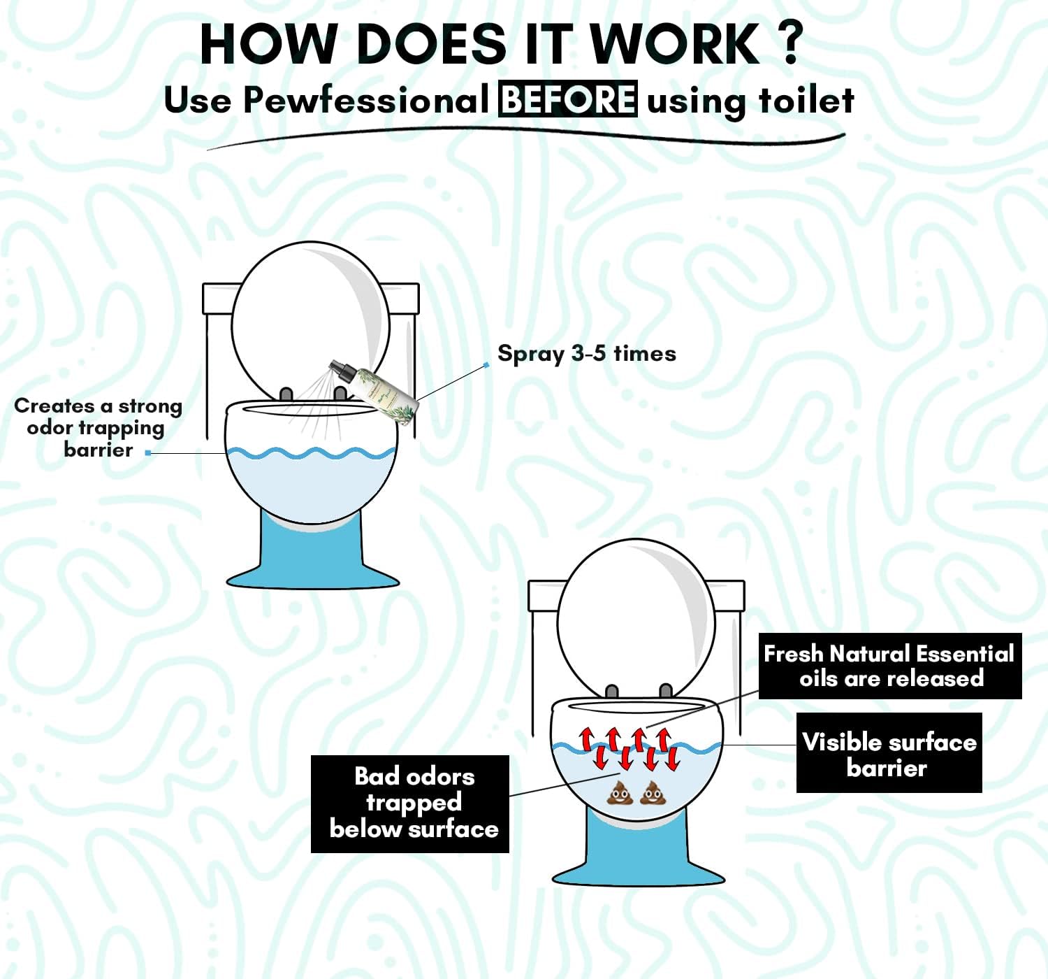- ACHIEVE FANTASTIC PERSONAL HYGIENE: Pewfessional Poop Spray odor eliminator ensures nasty poo smells stay trapped under the toilet’s water surface. Our proven formula works as a toilet Pooh odor eliminator by creating a strong, visible odor barrier that locks embarrassing toilet odors in the bowl before they can escape.