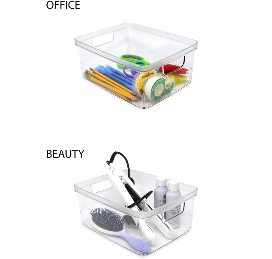 - CLEAR DESIGN: Staying organized is easy with these modern, clear plastic bins. The cutout handles make it easy to hold and carry. The clear design of each bin enables you to quickly see what’s stored in each container; ideal for when you’re on-the-go. These modern bins are designed to blend into the décor of any room while cleaning up the mess on your desk, counterspace and tabletops. [Dimensions of each bin: [8” L x 10” W x 4.25” H]