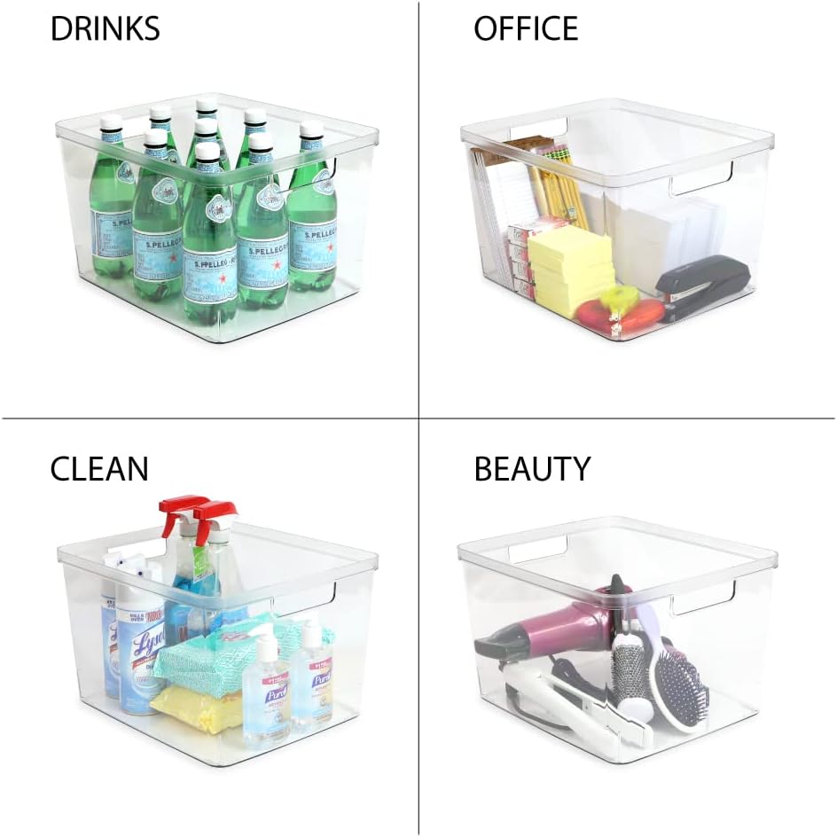 - CLEAR DESIGN: These clear plastic bins simplify the task of keeping an organized living space. The cutout handles make them easy to hold and carry from room to room. The transparent design of these bins enable you to quickly see what’s stored in each container; ideal for when you’re on-the-go. These modern bins are designed to blend into the décor of any room while cleaning up the mess on countertops, shelving units, and in cabinets. [Dimensions of each bin: [11.5” L x 14” W x 9” H]