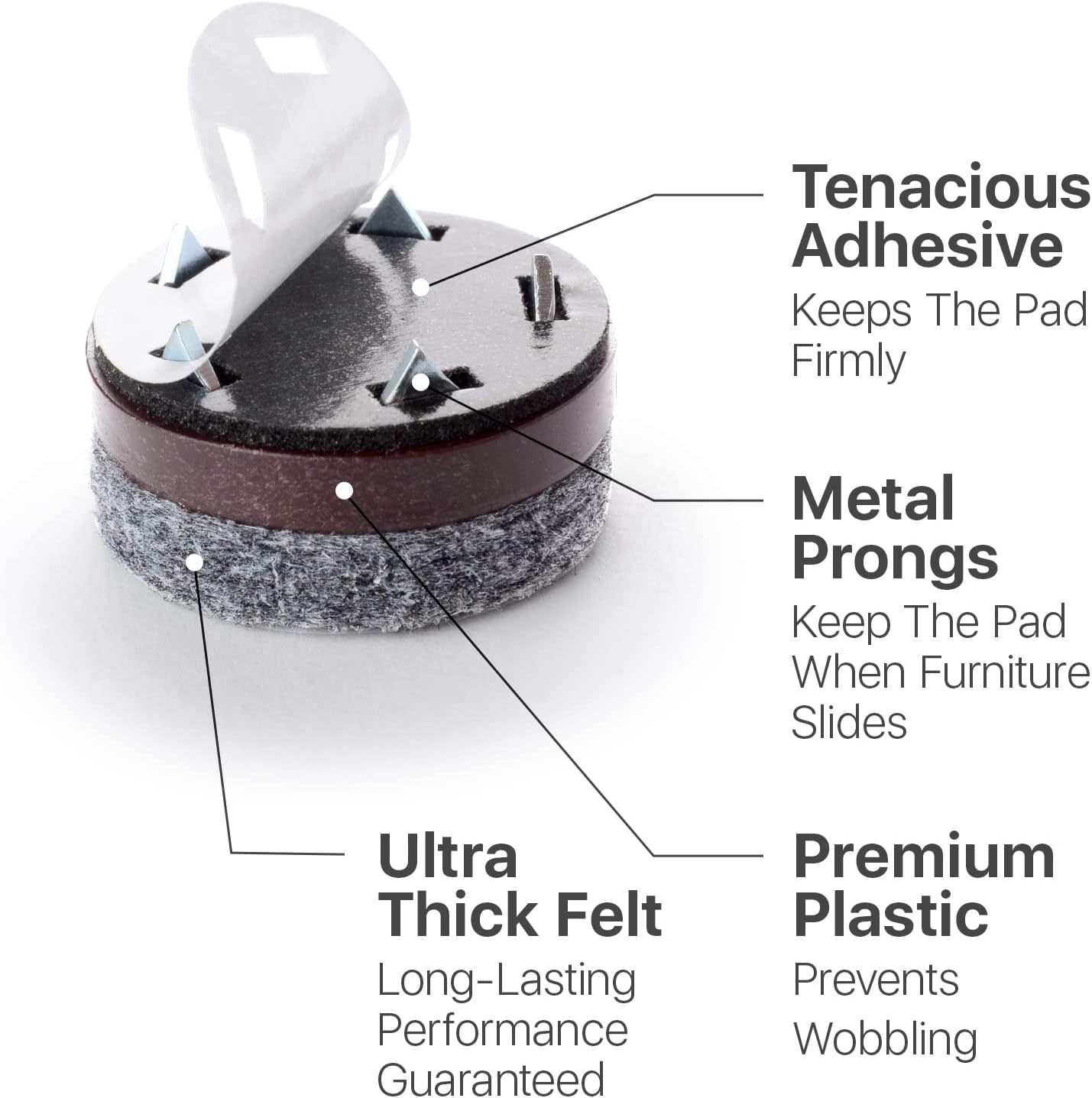 - βοΈ PREMIUM MATERIALS - 16 PCS Furniture Felt Pads consist of Thick Felt, Safe Plastic, Tenacious Adhesive, and Metal Prongs - THIS COMBINATION CREATES STRONG SHIELD BETWEEN FLOOR AND FURNITURE!