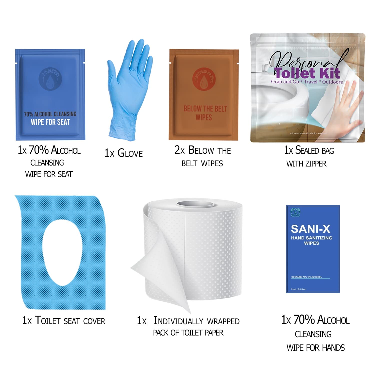 - ALL THE ESSENTIALS YOU NEED:– Each Individual Pack comes with: 1 – Glove, 1 – Toilet Seat Cleansing Wipe, 1 - Toilet Seat Cover, 1 – Packet of Individually wrapped Toilet Paper, 2 – Below the Belt Wipes, 1 – 70% Alcohol Hand Cleansing Wipe all packed together in a a convenient to carry Zip Top Bag.