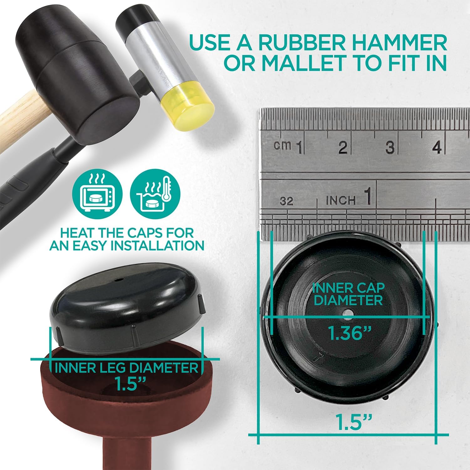 - A Breeze To Install - These round caps are meant to fit snugly onto chair legs with an inner diameter of 1.5”. Simply pop them into your furniture’s feet and hit using a rubber hammer or a mallet.