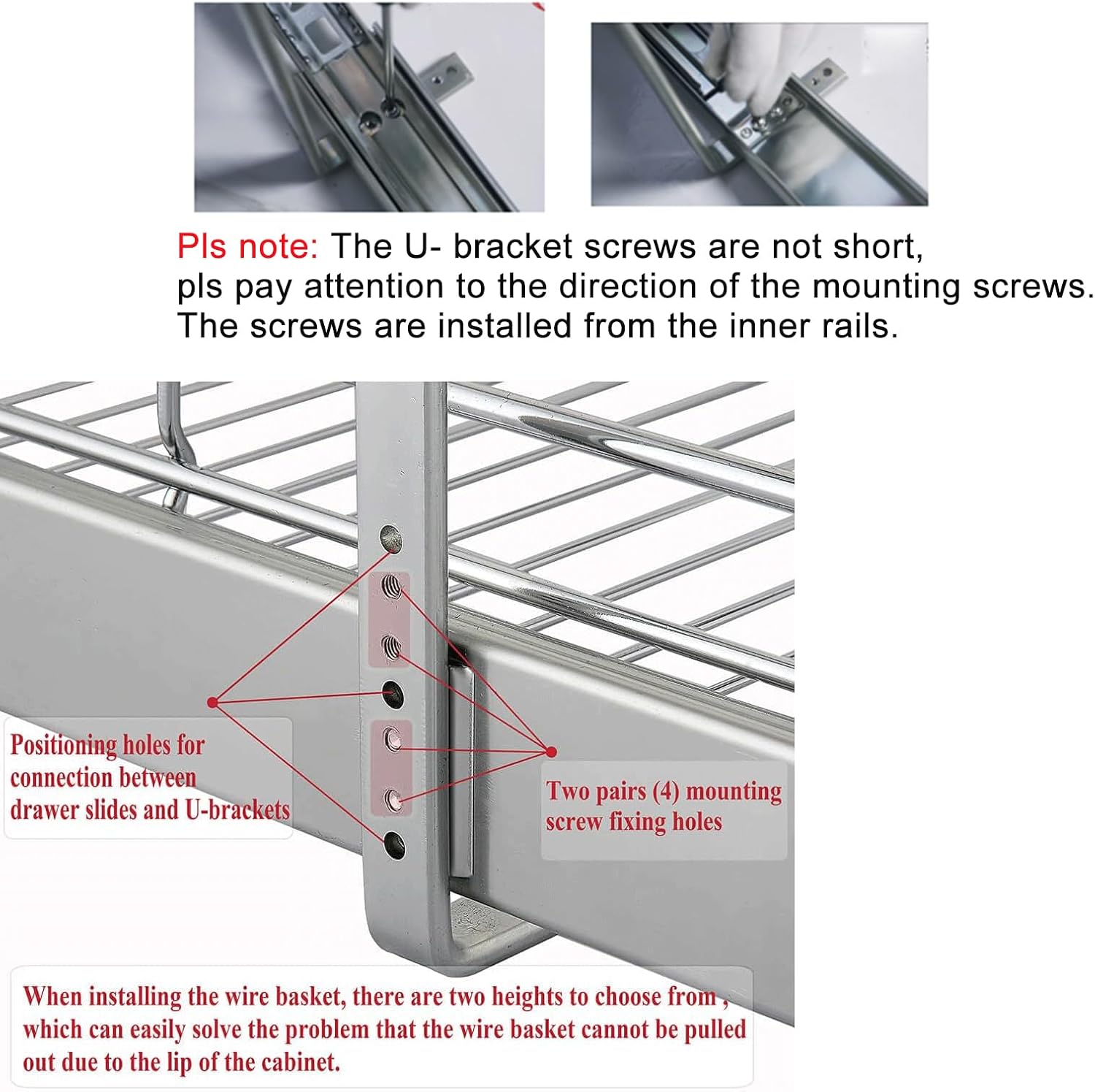 - π Easy to Install: 2 tier pull out shelves --- πOverall Size is 20" W X 21" D X15"H, πThe Basket Size is 18.5" W X 21"D , This 2 tier slide out cabinet organizer needs more than 20 " W net width or larger cabinet openings,net width measure from the hinge Min cabinet interior depth: 22.5 inch. DINDON Cabinet Pull Out Shelf comes with all the hardware necessary for a quick, easy install. Rear mounting brackets are optional and can be used or not. Pls note: The U- bracket screws are not short, pls pay attention to the direction of the mounting screws, the screws are installed from the inner rail. Watch the Amazon installation videos if you have any questions, they explain it all.