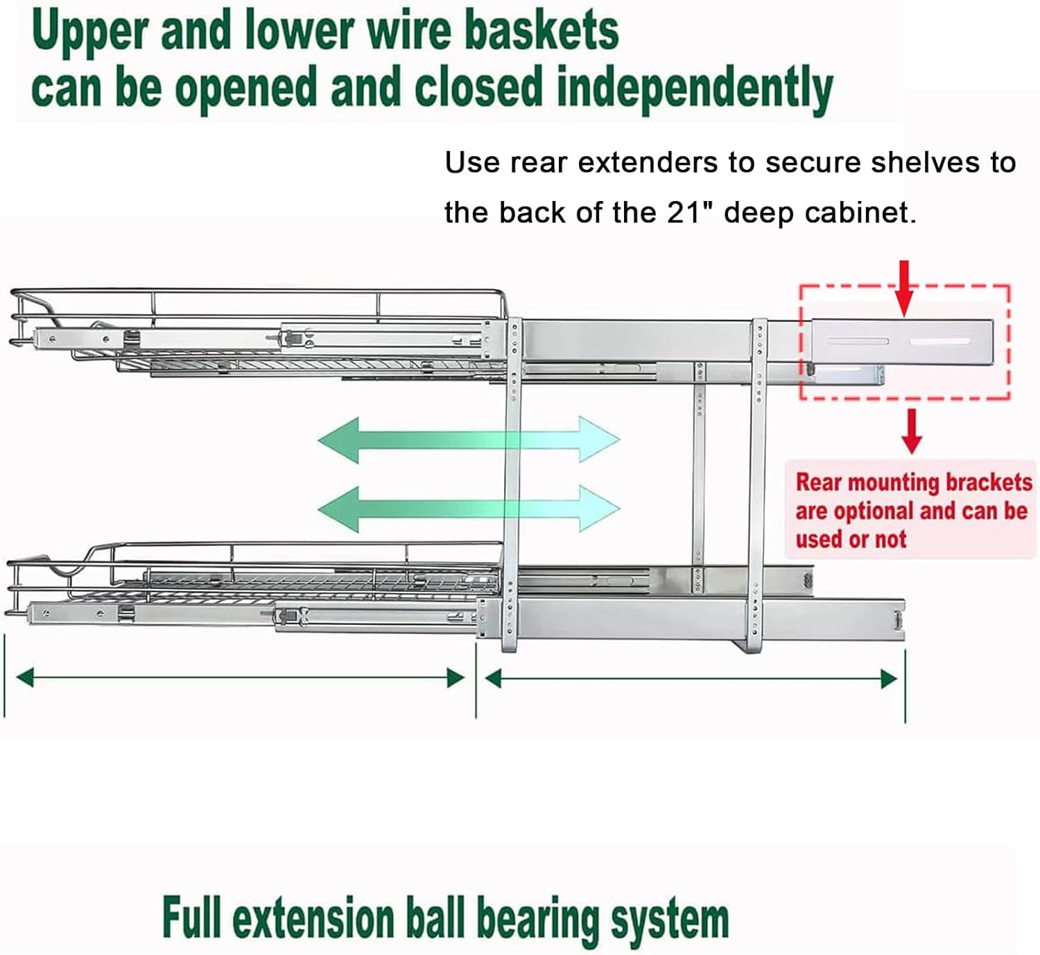 - ※ More Convenient and Practical: This Cabinet Slide Out Shelves both top and bottom shelves fully slide out independently on precision ball bearing slides so you can reach to your items easily and more quickly. Each tier can hold up max weight is 75 lbs without stretching, the weight capacity of each tier in the extended position is less than 40 lbs.