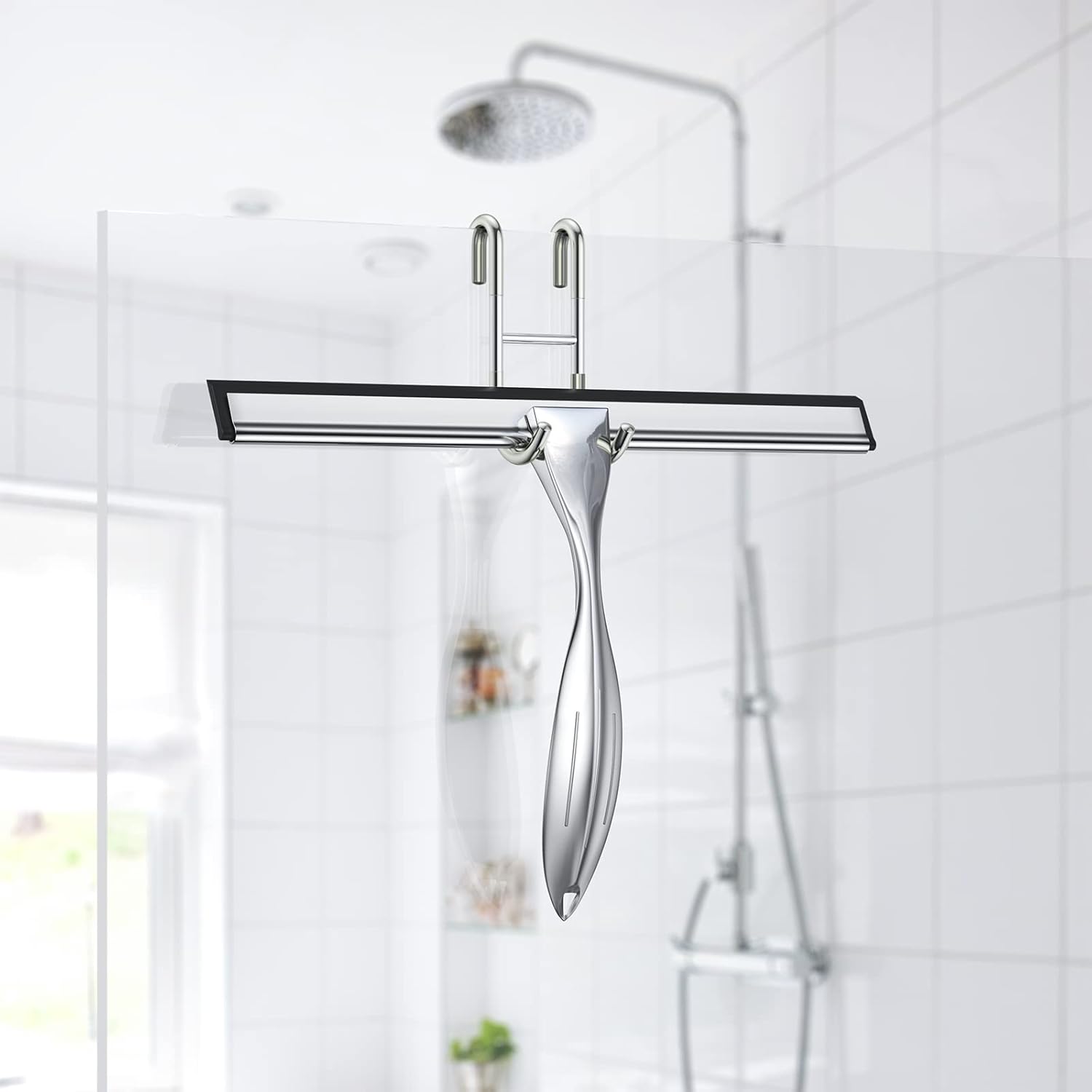 Shower Squeegee for Glass Door 12-Inch Stainless Steel Bathroom Squeegee Window Wiper, Includes Shower Door Hook, Adhesive Hook, and Spare Silicone Blade for Window Mirror Car All-Purpose Squeegee