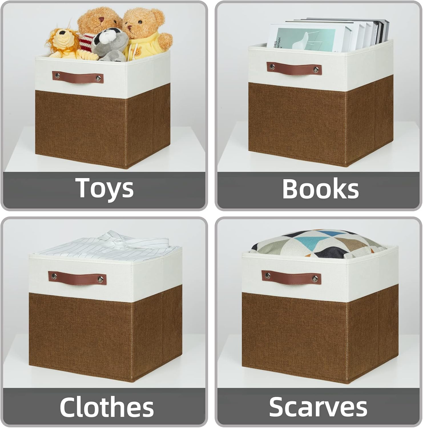 HNZIGE Fabric Cubes Storage Bins Set of 4,11 x 11 Clothes Storage Cube Baskets,Cube Organizing Bins for Shelves with Handles,Canvas Baskets for Organizing Home(Brown White)
