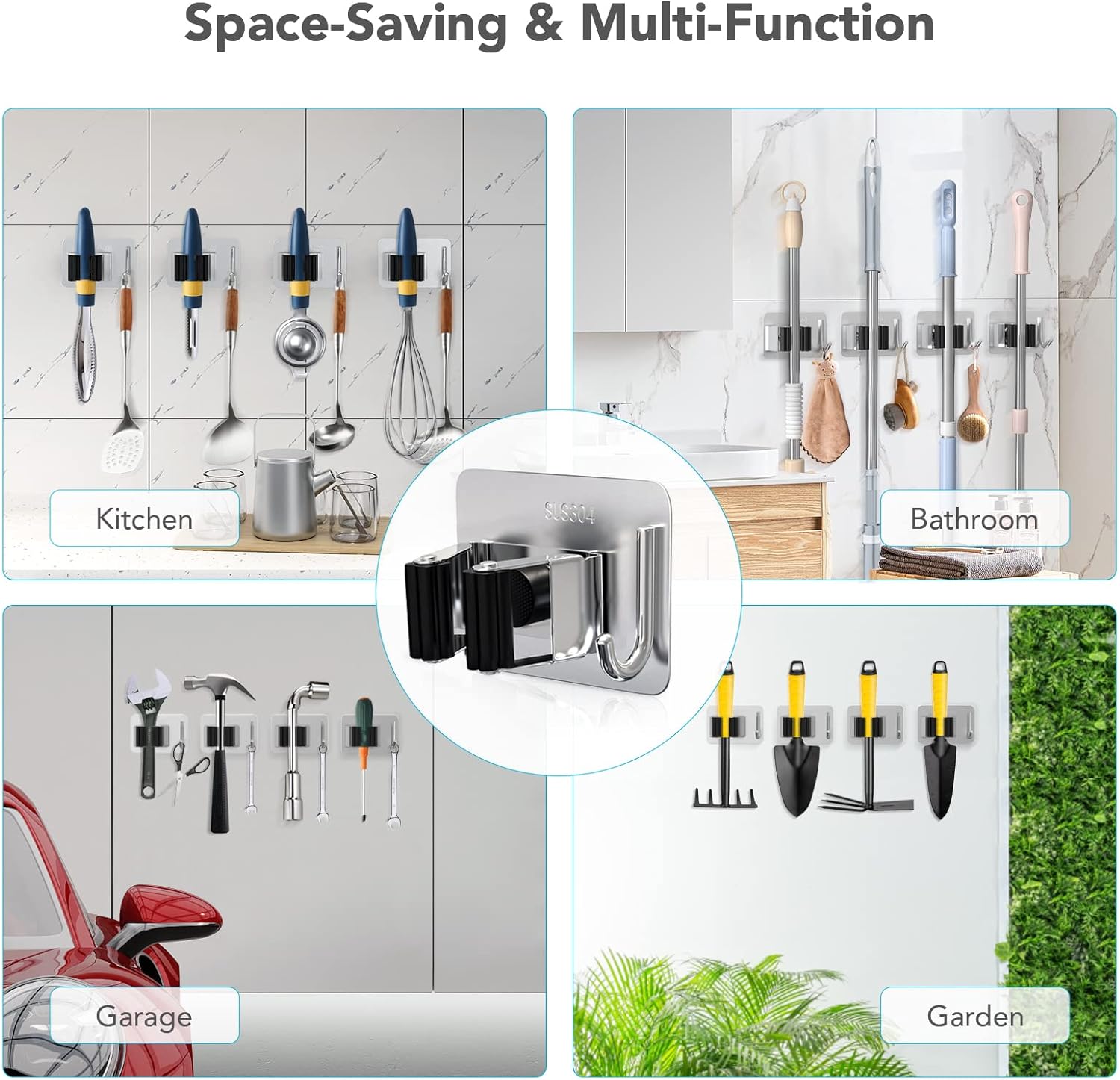 - ā Multi-purpose Storage: Self adhesive mop organizer is helpful to organize the mop, broom, umbrella, brush, shovel and other tools, keeping your home clean. The hooks can hang a variety of daily items, improving storage space