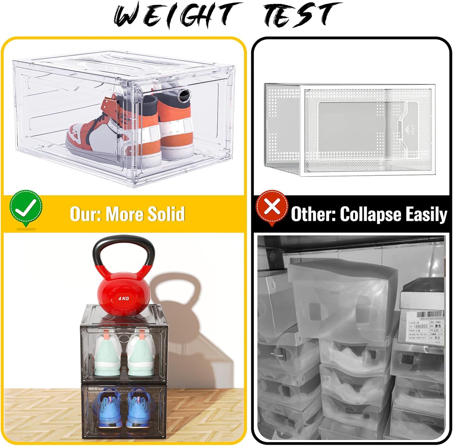 - Multipurpose storage: These clear shoe boxes stackable is designed for making it easier to find anything in need. Good for organizing with shoes, clothes, socks, hat, underwear, bra, scarves and accessories. Finally, stack the boxes neatly to save a lot of space.