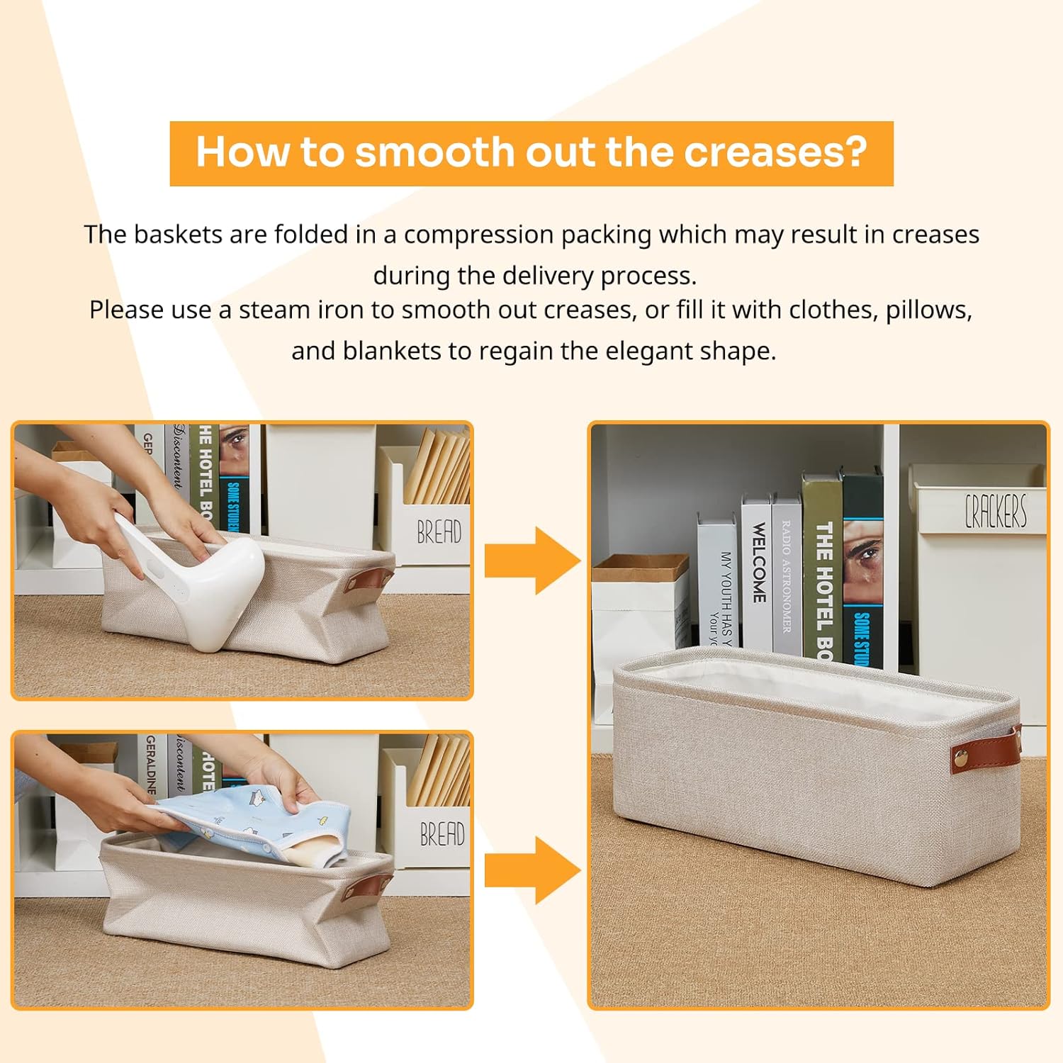 - 【EASY TO CARE】The narrow storage basket is sturdy and has no odor. Built to last these bins are reinforced with an O-ring on the top to give shape and structure so they are not machine washable. Lined with a thin linen fabric, the small storage bins are easy to clean, just wipe with a damp sponge or cloth.