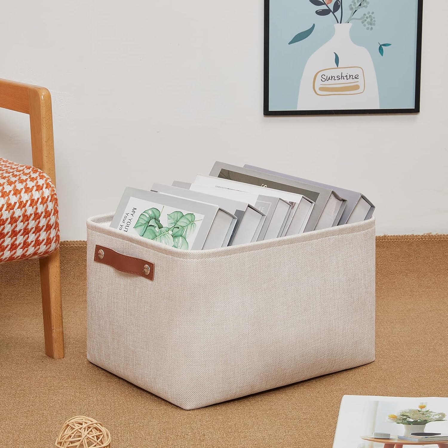 - 【PREMIUM MATERIAL】The medium storage basket is made with sturdy extra thick linen cationic fabric exterior and linen polyester interior lining. Strong upper metal keeps the shape and structural. The handles are made of premium quality leather and fixed on both sides of the basket by rivets.