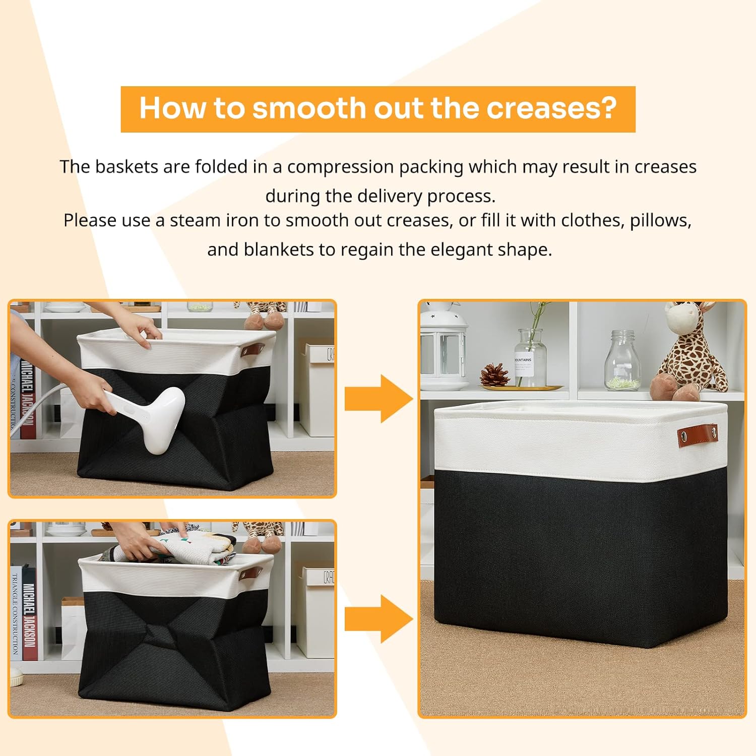 DULLEMELO Large Fabric Basket for Organizing, 17"x12"x15" Storage Basket With Leather Handles, Collapsible Storage Bin for Clothes, Toys, Books, Office, Bedroom, Closet, Nursery&Laundry (White&Black)