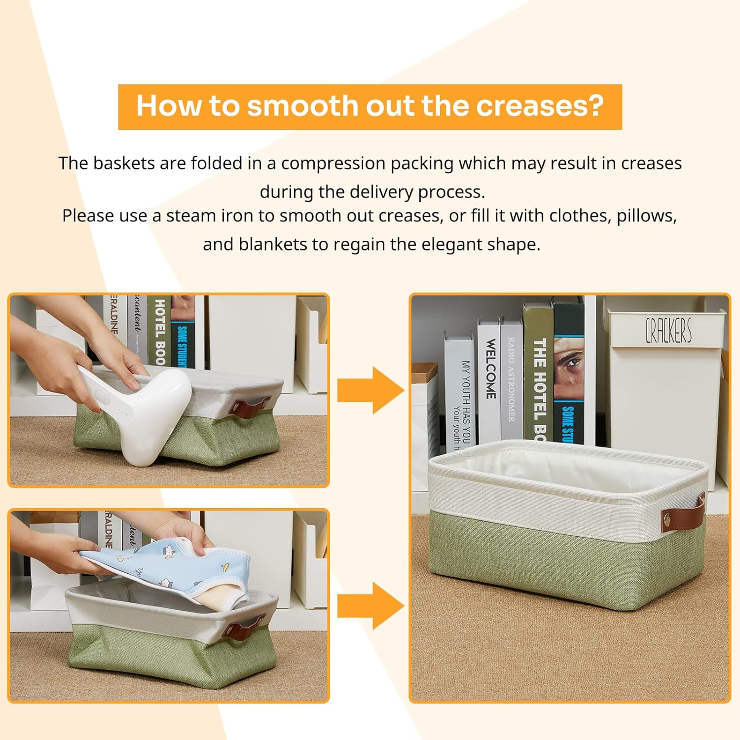 - 【EASY TO CARE】The small storage basket is sturdy and has no odor. Built to last these bins are reinforced with an O-ring on the top to give shape and structure so they are not machine washable. Due to lined with a thin linen fabric, they are easy to clean, just need to wipe with a damp sponge or cloth.