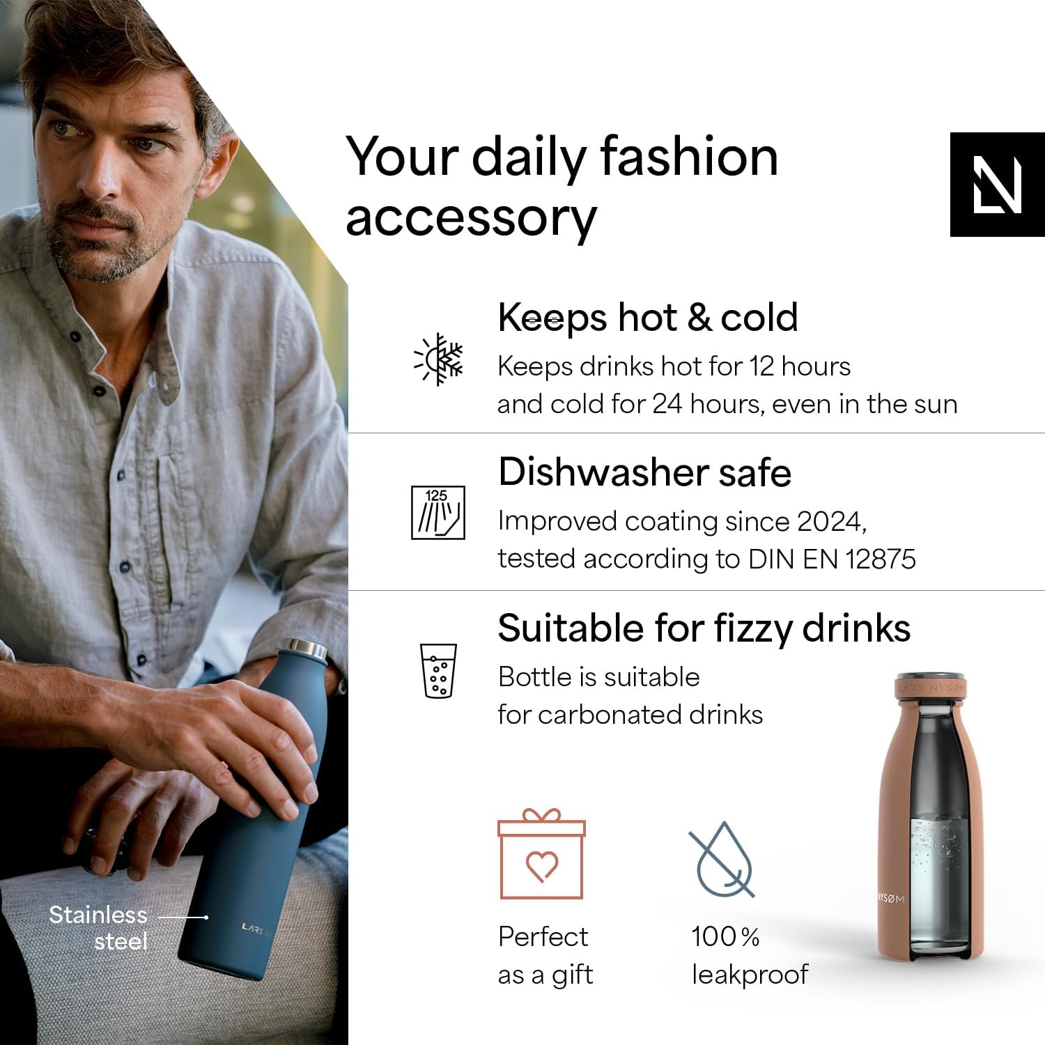 - THERMAL BOTTLE WITH VACUUM INSULATION 12H HOT/24H COLD: The water bottle has a double-wall vacuum insulation and keeps drinks up to 12h hot and 24h cold. Perfect for cold and hot drinks on the go like coffee or tea.
