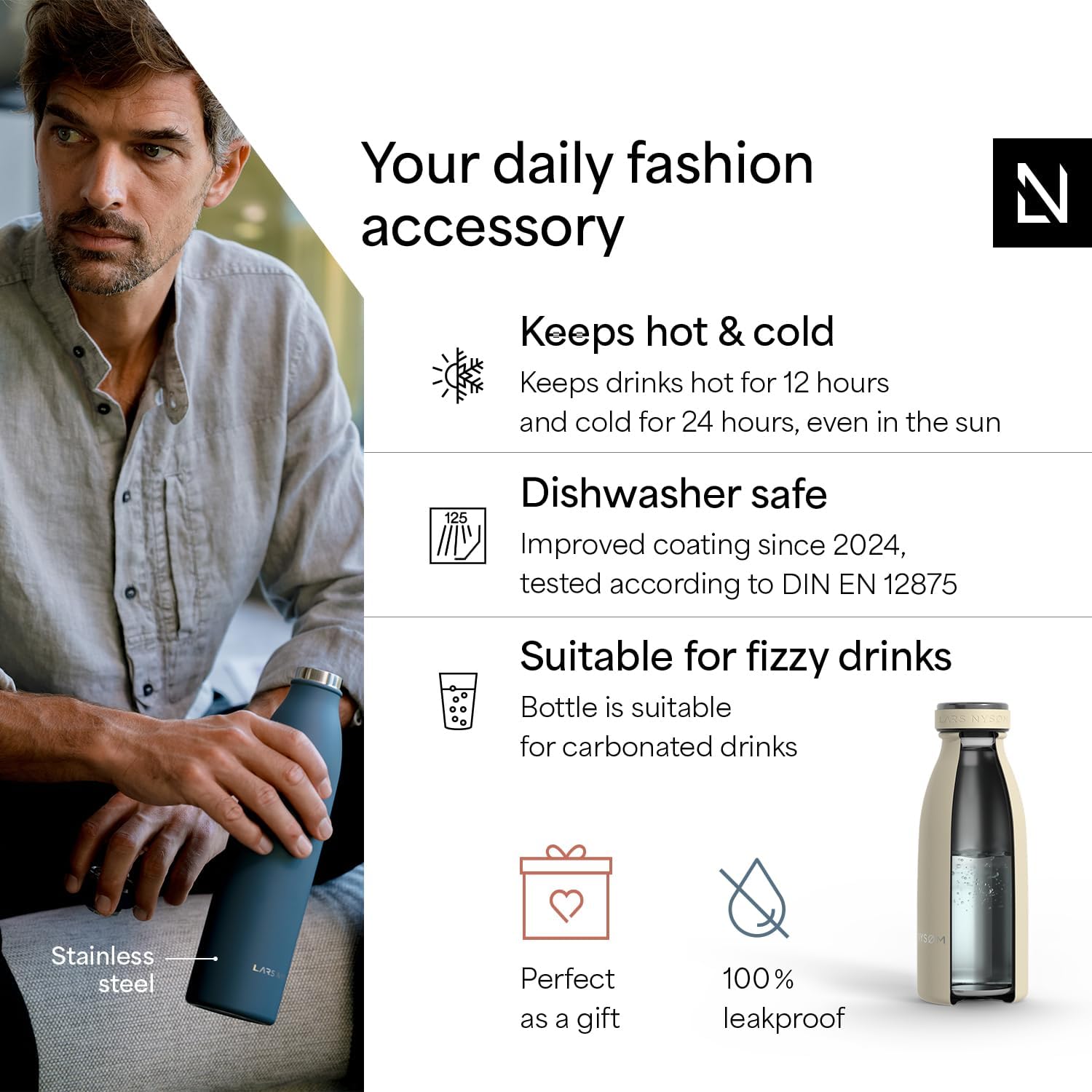 - THERMAL BOTTLE WITH VACUUM INSULATION 12H HOT/24H COLD: The water bottle has a double-wall vacuum insulation and keeps drinks up to 12h hot and 24h cold. Perfect for cold and hot drinks on the go like coffee or tea.