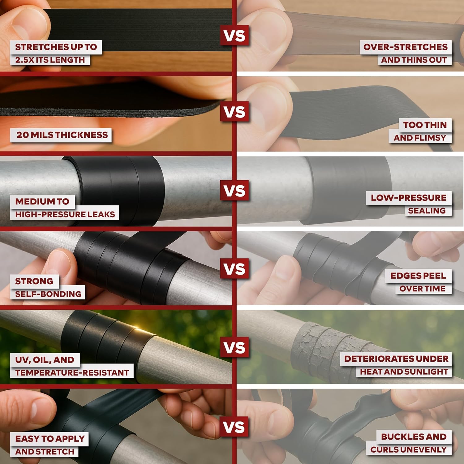 - Flexible. STRETCH THE SILICONE SEALING TAPE UP TO 300% FROM ITS INITIAL LENGTH WHEN APPLYING IT TO ACTIVATE IT. Lengthen while wrapping with 2/3 overlap to ensure that it's appropriately sealed—this pressure sealing guarantees superior water and airtight sealing performance for high-pressure pipe leakages. It also remains flexible even if it's exposed to abrasion and cold temperatures up to -50°C (-60°F).