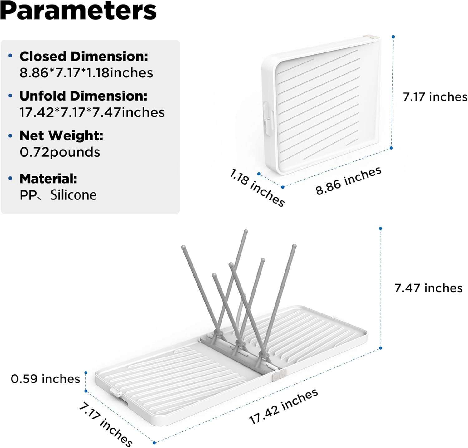 - ✈【Foldable Design】The size of the portable bottle drying rack for baby bottles is 17.42 x 7.17 x 0.59 inches when opened for use. It can be folded for storage when traveling or when not in use, and it measures only 8.86 x 7.17 x 1.18 inches when folded.