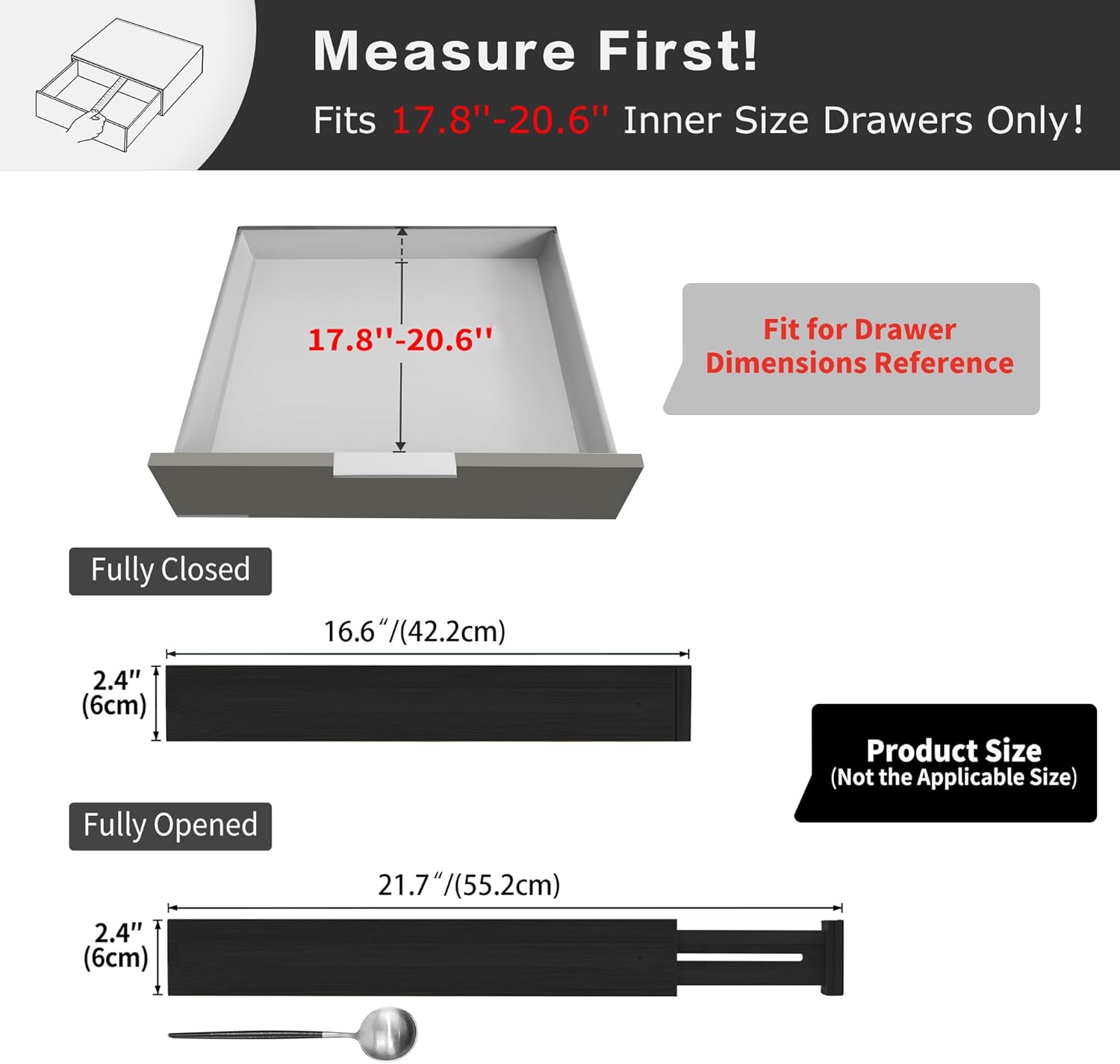 - Recommend Drawer Dimension: **Measure Your Drawers Before Buying!** This product is designed for drawers with an inner size of 17.8" to 20.6". If your drawer's inner size exceeds 20.6", it will doesn't work