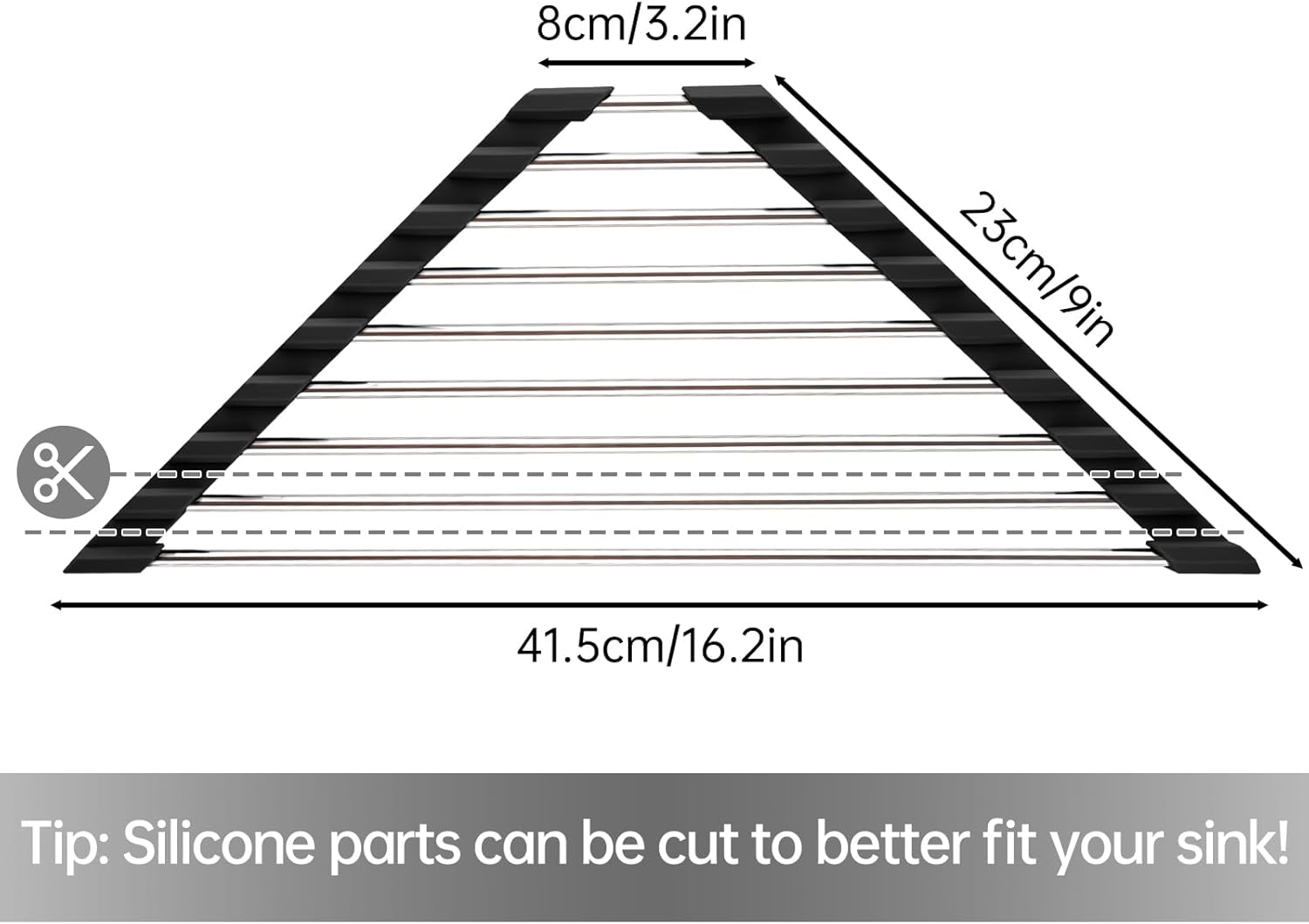 - âď¸ăSpace SavingăThis over-sink dish drying rack takes up little space and the foldable design allows you to quickly roll it up for easy storage and make your kitchen look less cluttered. It is the best cutlery drainer for your kitchen and can replace bulky dish racks and colanders. Suitable for most standard sinks and drawers. Please kindly check your sink size before purchasing.