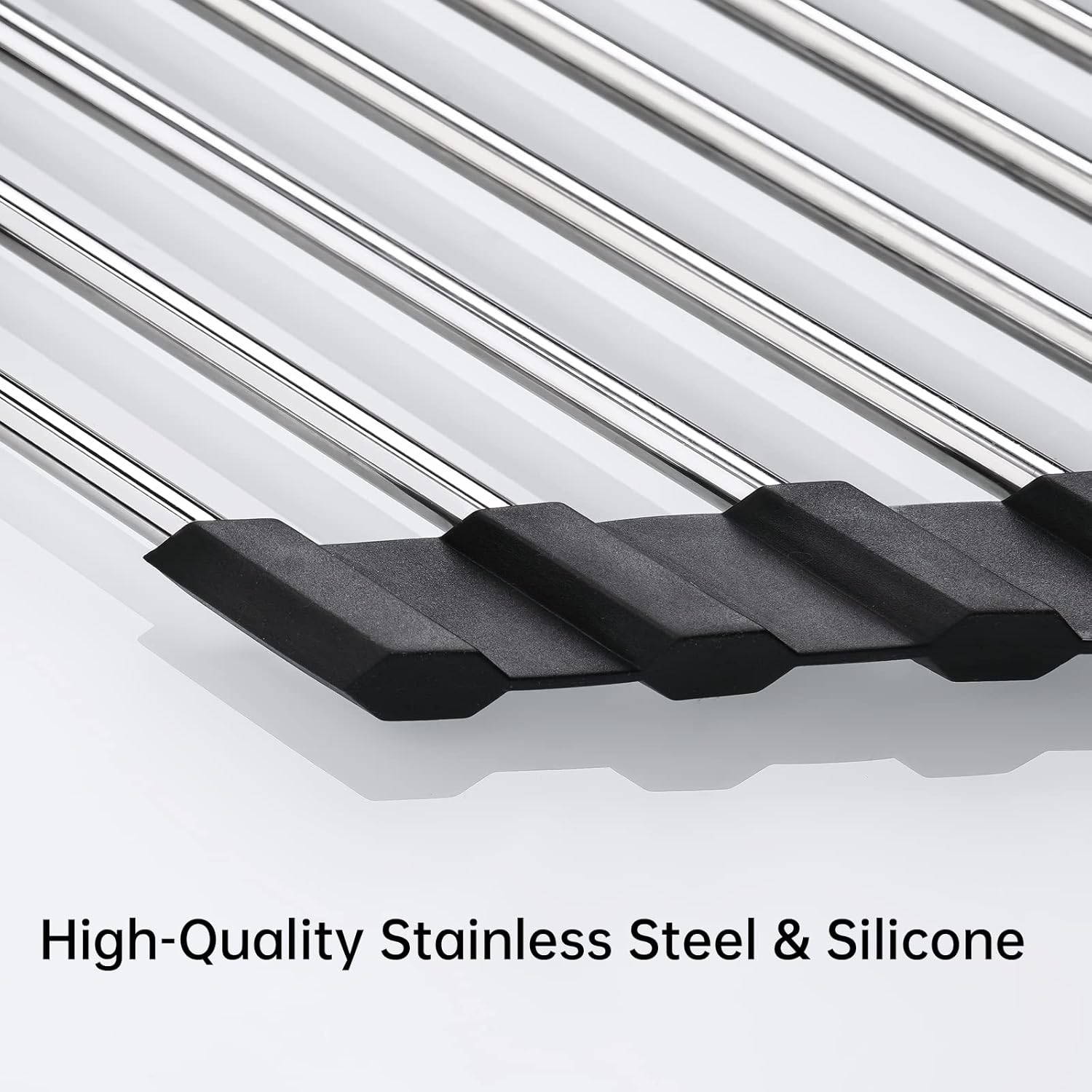 - âď¸ăFood Grade MaterialsăMade of premium quality SUS304 stainless steel and BPA-free food safe silicone edges, this drying rack is waterproof, rust-proof, durable and scratch-resistant. Solid construction with non-slip silicone ends securely attached to stainless steel rods.