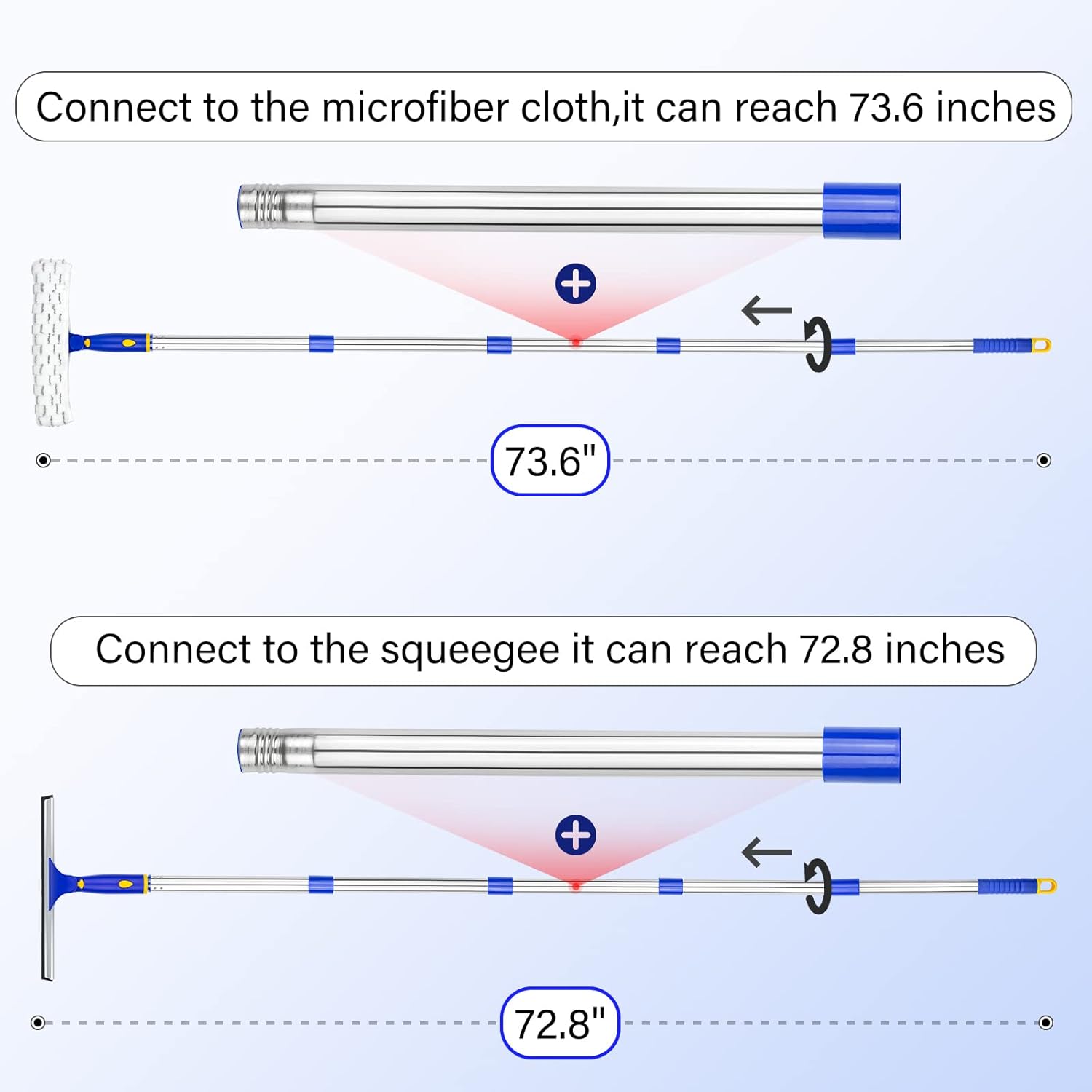 - Easy to Assemble: Just screw on the poles to complete the installation (The last section of pole is extension pole). The squeegee handle can be adjusted from 45"to 73". Meet various height requirements for you to clean the truck or high window. When you don't use the window squeegee, you can disassemble and store it. The microfiber pad of the long-handled squeegee can be removed to support both hand &machine washing. 2 sets of rods, no need to replace it between squeegee and microfiber cloth.