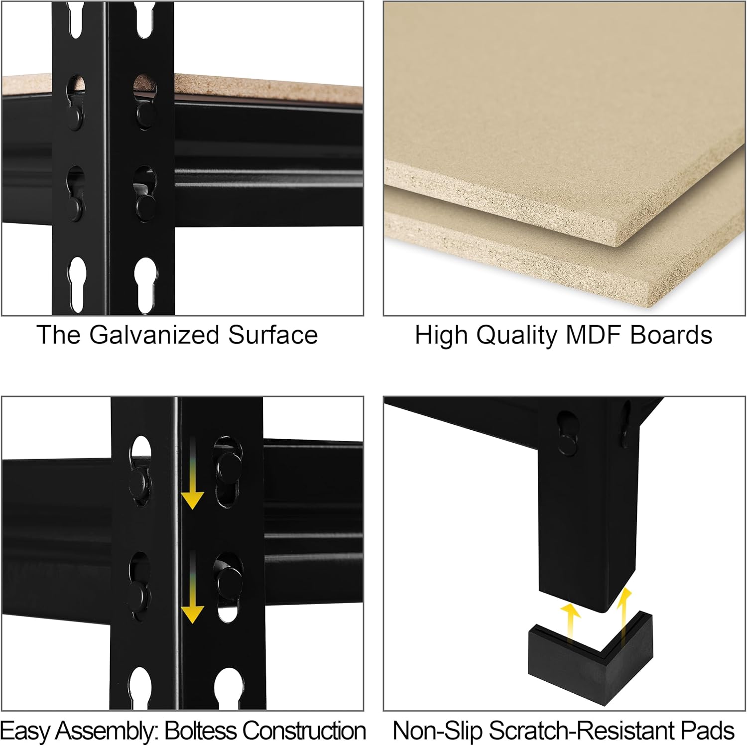 - ă HEAVY DUTY & LONG-LASTINGă : This 5-tier garage shelving is made of high-quality 0.3" thicker MDF boards and 0.03" thicker heavy duty galvanized metal frame, sturdy and enduring. The metal frame is covered with premium powder coating to give it a smooth surface. Each shelf holds up to 265 lbs, 5 tier shelves' total max load weight is 1325 lbs