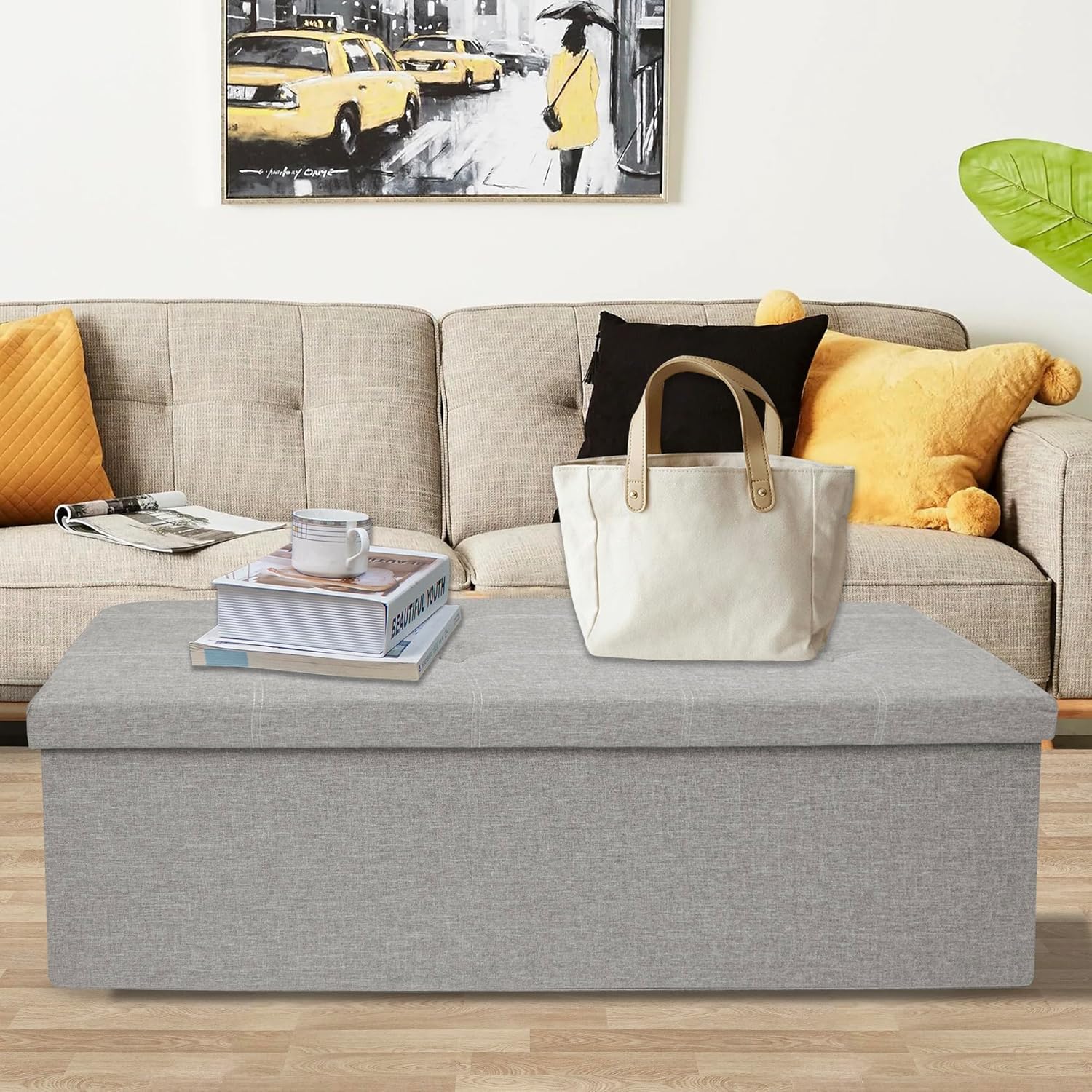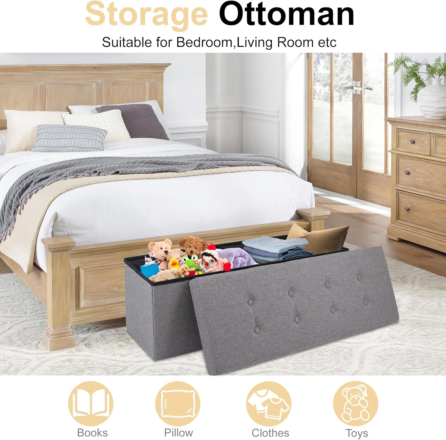 - Versatile Storage Bench: Use this 43-inch storage ottoman as a storage box, footstool, or coffee table. It fits seamlessly into the living room, bedroom, entryway to meet various needs