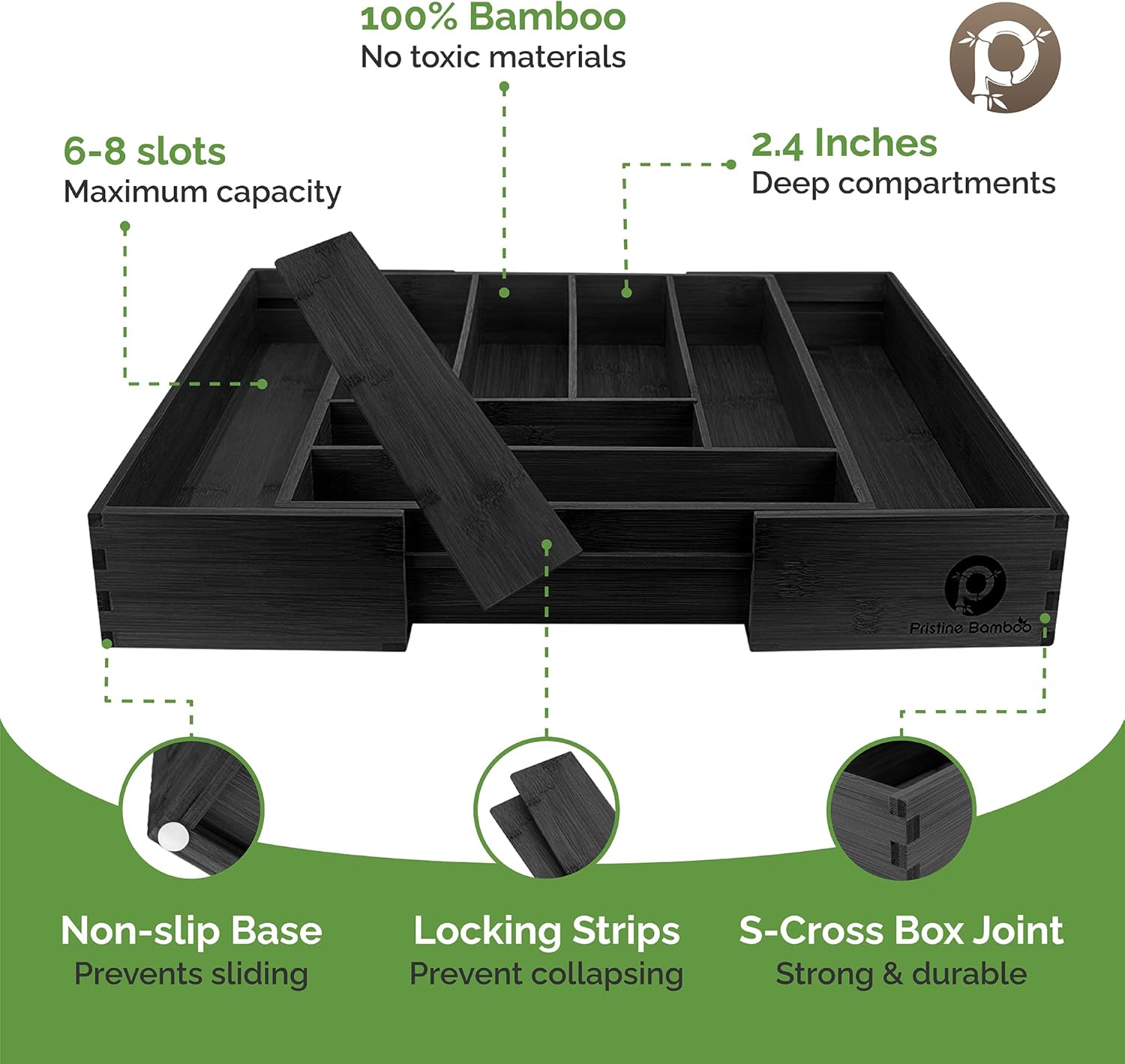 - NATURAL SLIP-RESISTANT CONVENIENCE: Our expandable kitchen storage is made of 100% organic Moso bamboo without the use of a toxic MDF bottom that other adjustable utensils organizers use. It won’t slip around in your drawer and It doesn’t hold in moisture the way wood silverware trays do.
