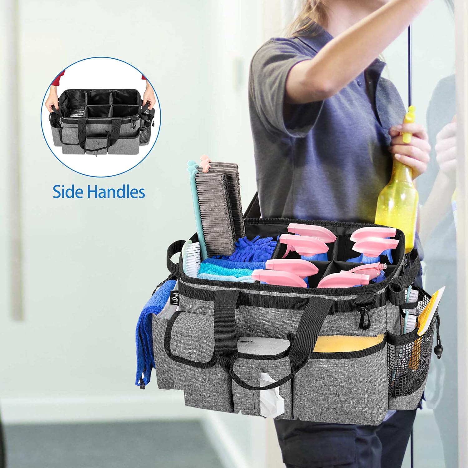 - Large Capacity: Cleaning caddy bag has a detachable inner divider that divides a large compartment into 5 compartments, making it easy to organize cleaning supplies neatly; Lots of space for regular cleaners, the refill bottle, floor cleaner, etc